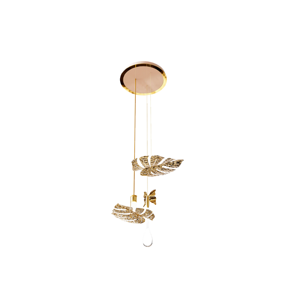 The Rainforest elegant pendant is unparalleled in the refinement and grace it represents. The gold-plated brass coupled with clear crystal glass - applied by hand - brings a delicate charisma that resembles nature in full bloom.