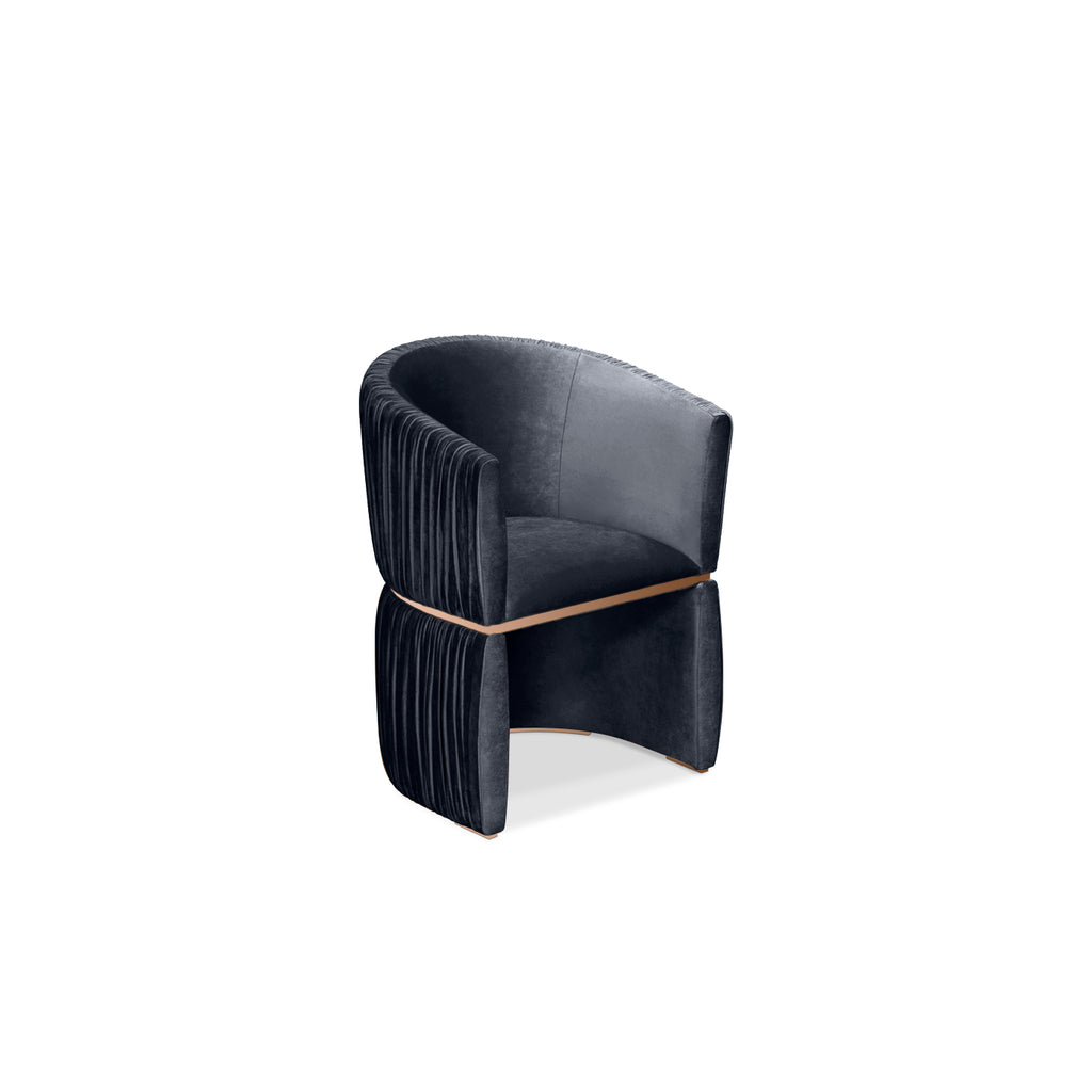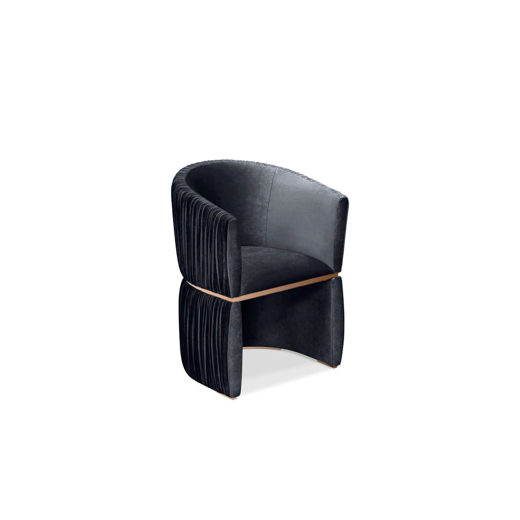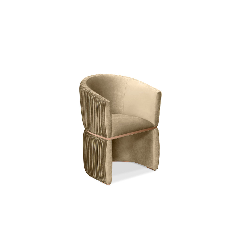 Inspired by the classic cuff bracelet style, the Cuff chair’s elegant curved shape comfortably embraces its guests. Gorgeous folds of ruched fabric wrap the chair’s exterior and a stylish polished brass band cinches its waist.