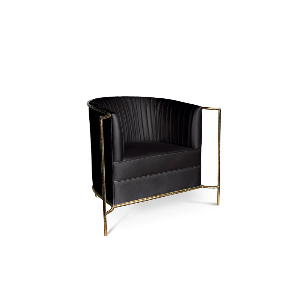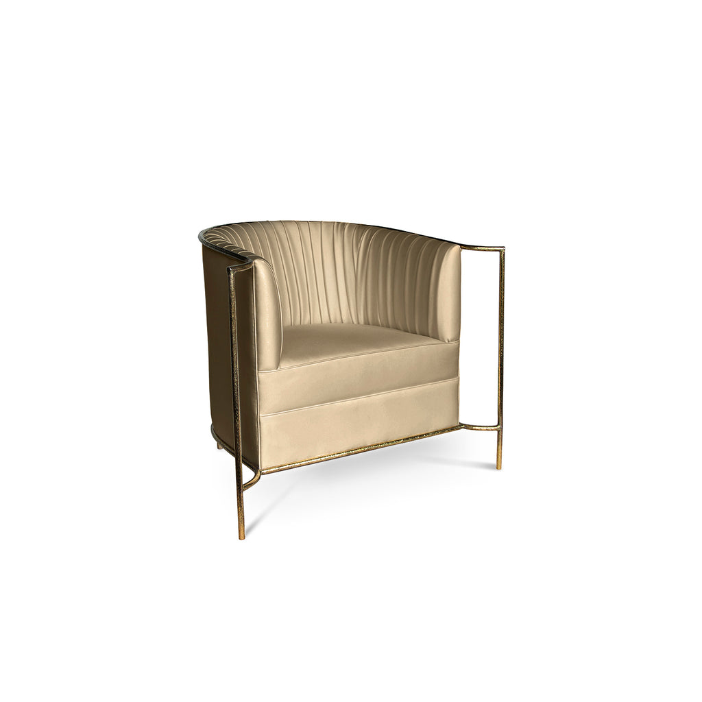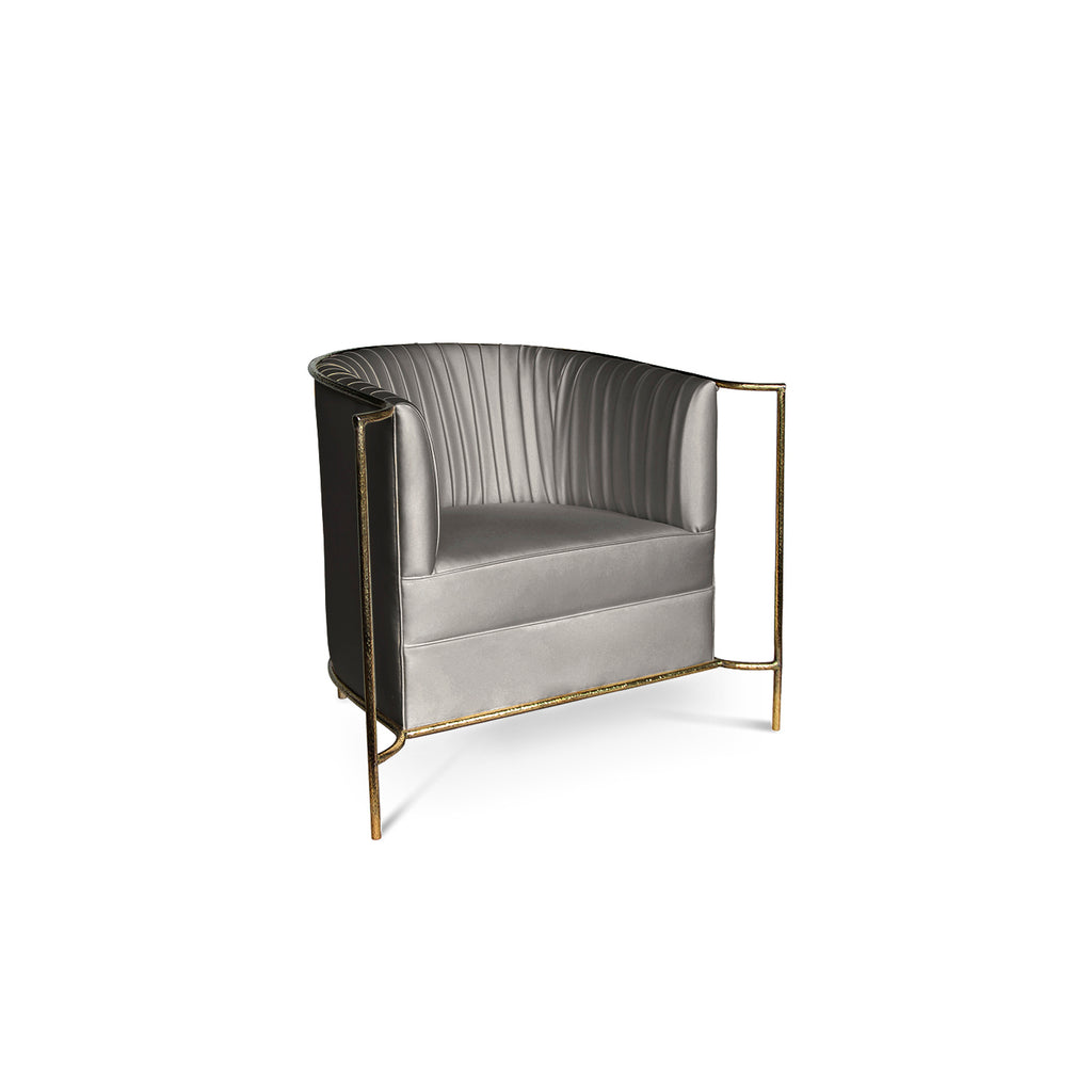 Ignite your desire to be wanted in the comfort of this provocative, fully upholstered pleated chair. A textured, hammered metal band outlines its curves the way the mind outlines the female desire.