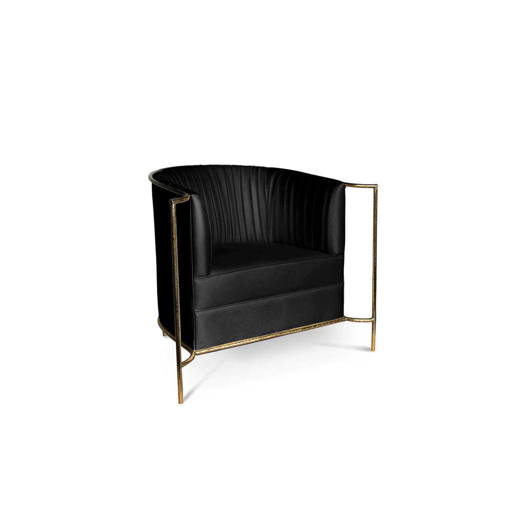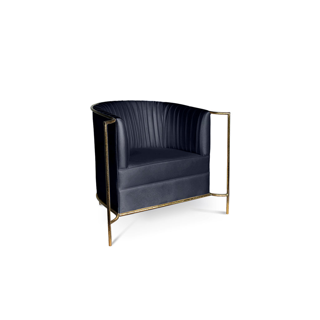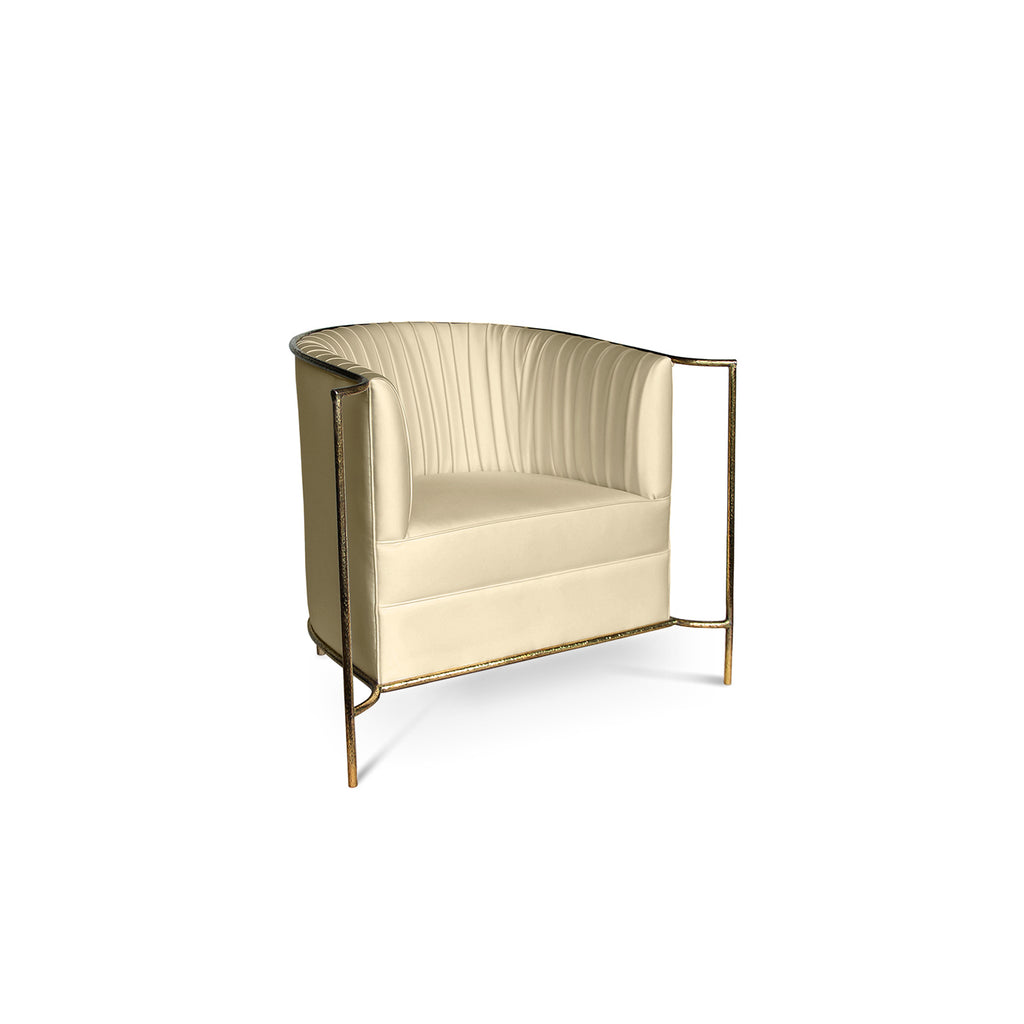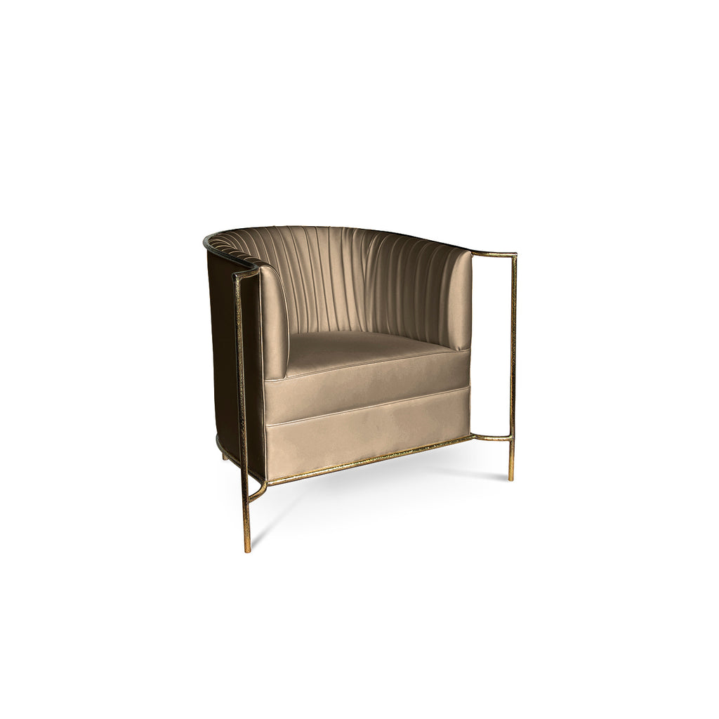 Ignite your desire to be wanted in the comfort of this provocative, fully upholstered pleated chair. A textured, hammered metal band outlines its curves the way the mind outlines the female desire.