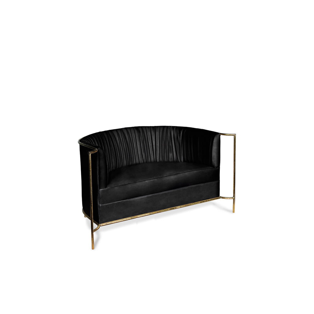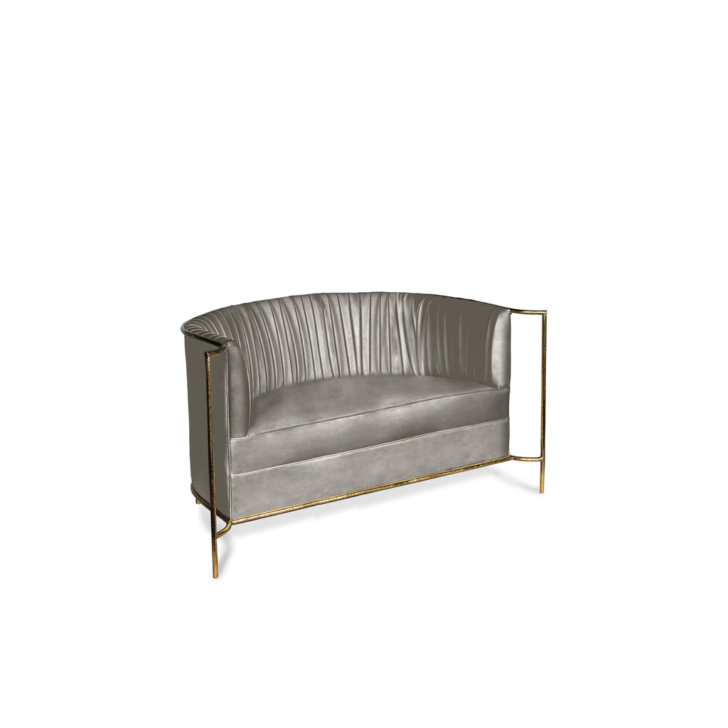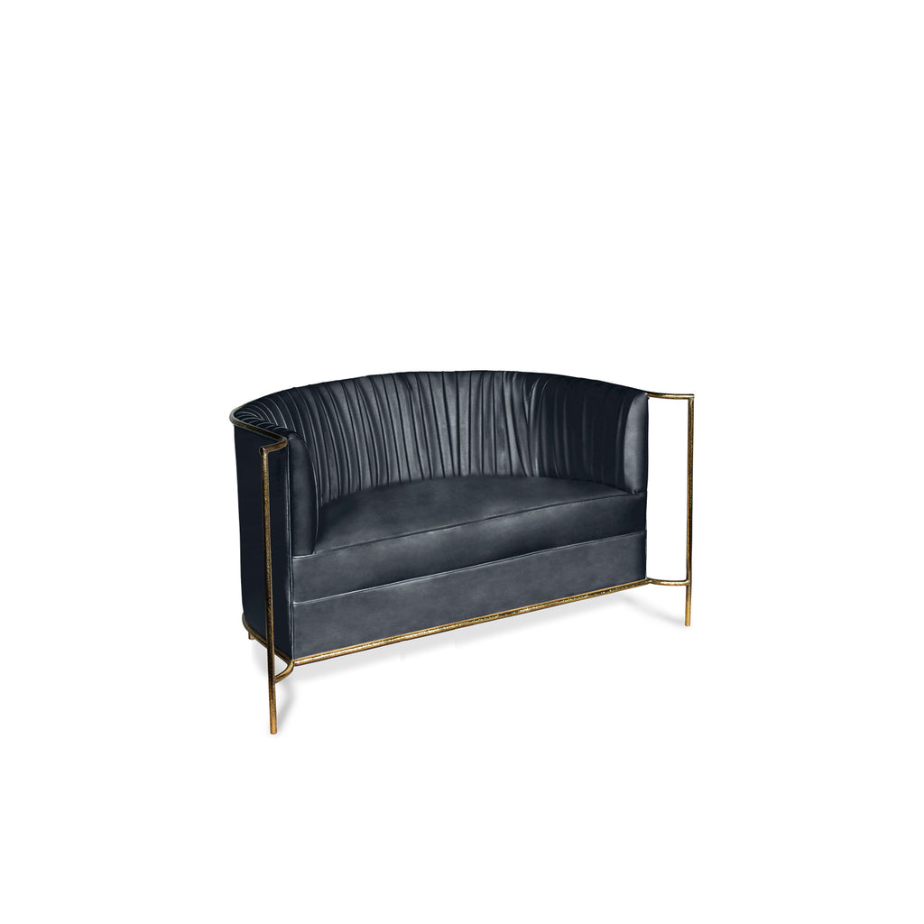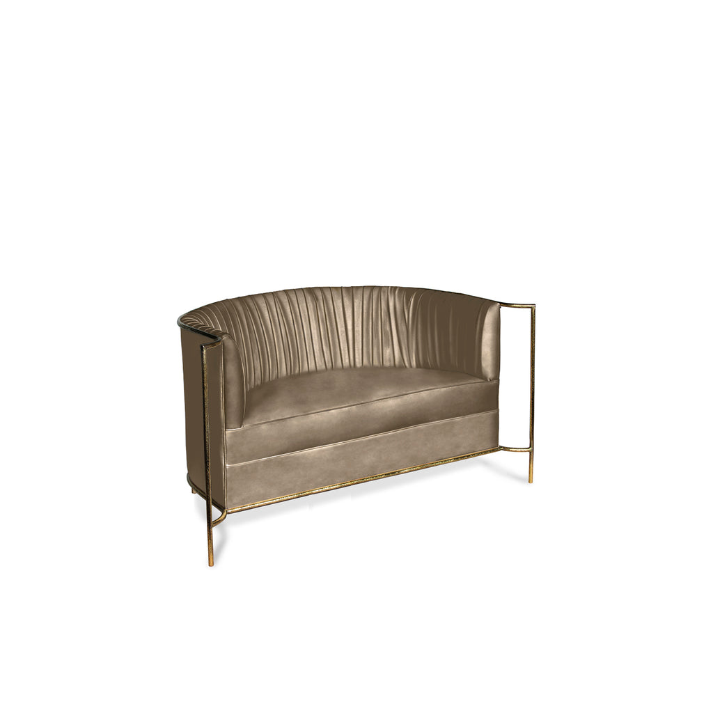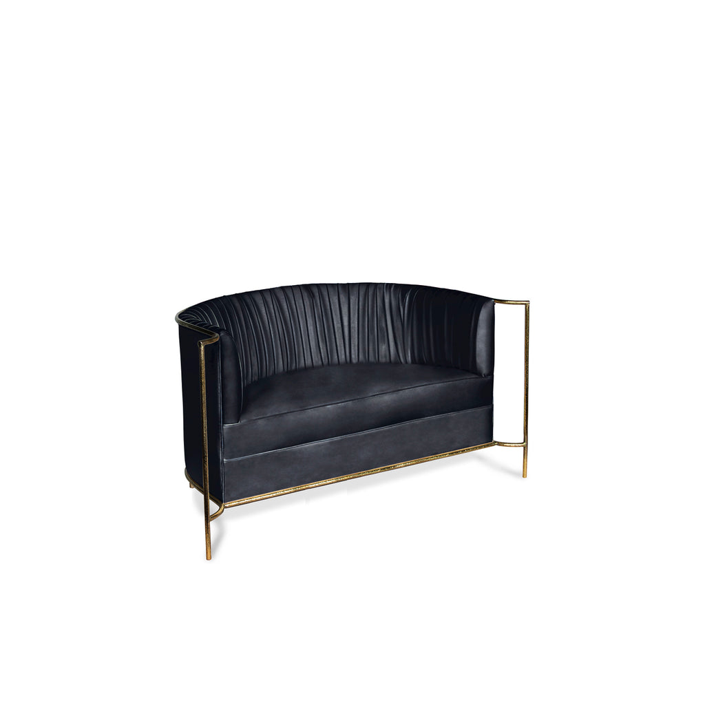 Ignite your desire to be wanted in the comfort of this provocative, fully upholstered pleated sofa. A textured, hammered metal band outlines its curves the way the mind outlines the female desire.