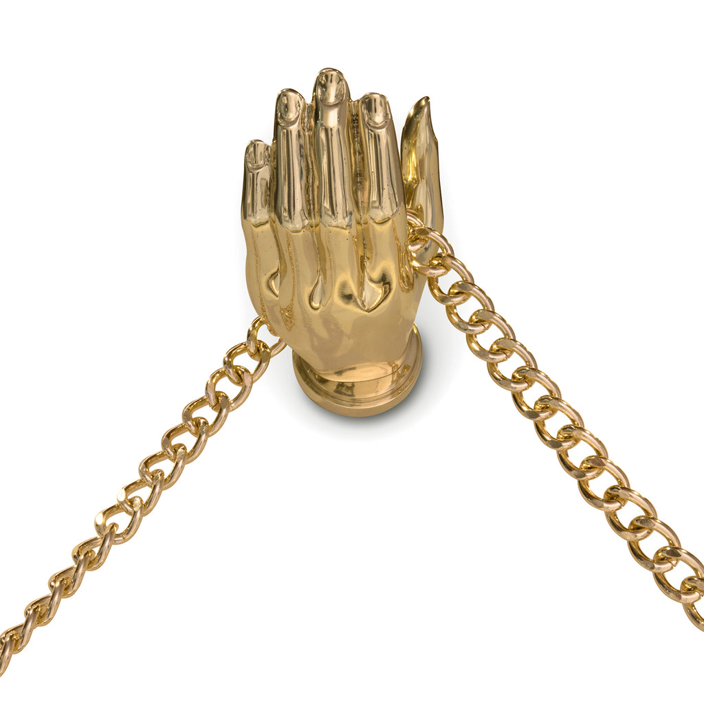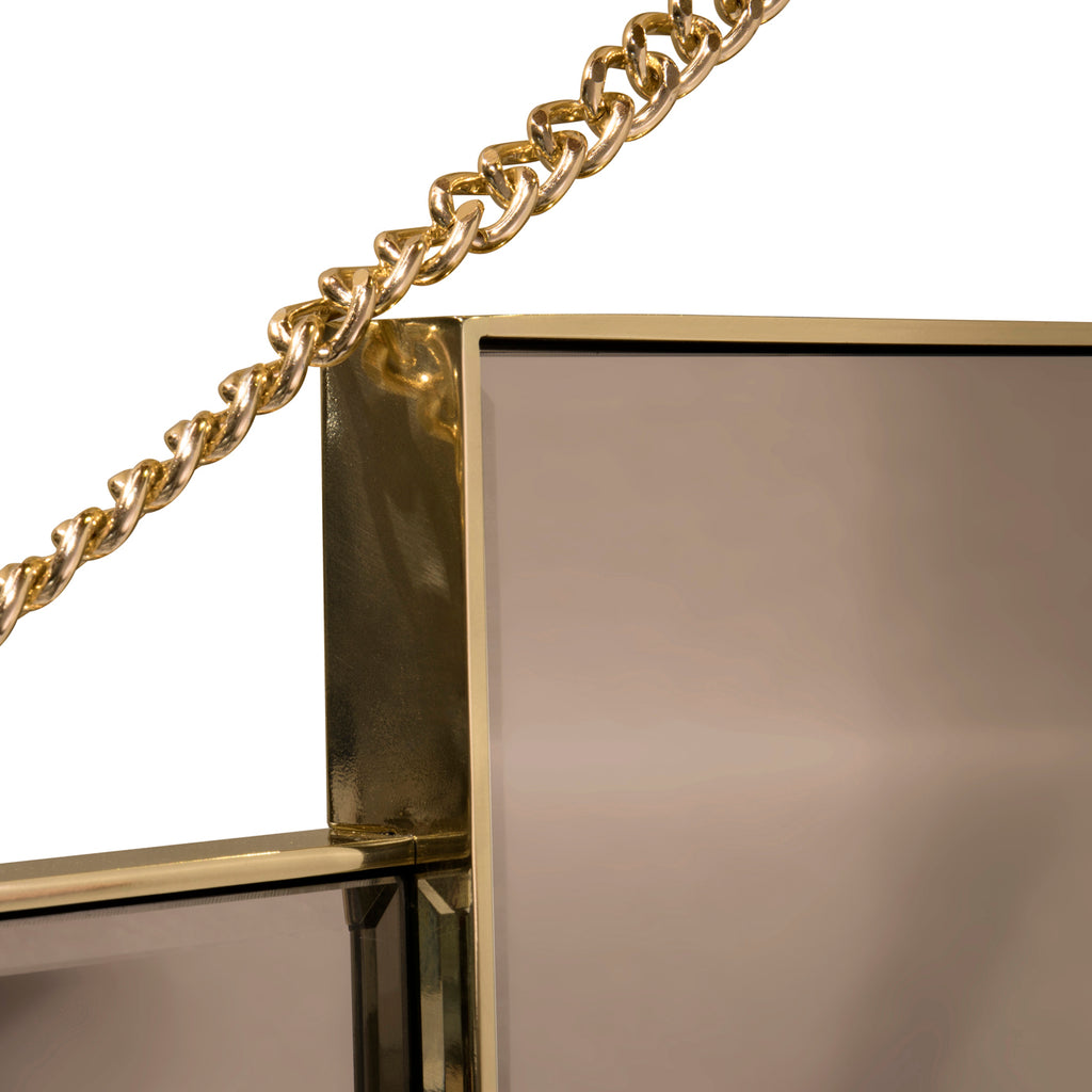 The simple style of this mirror brings together Art Deco symmetry with the touch of a delicate cast brass hand holding a chain in its palm.