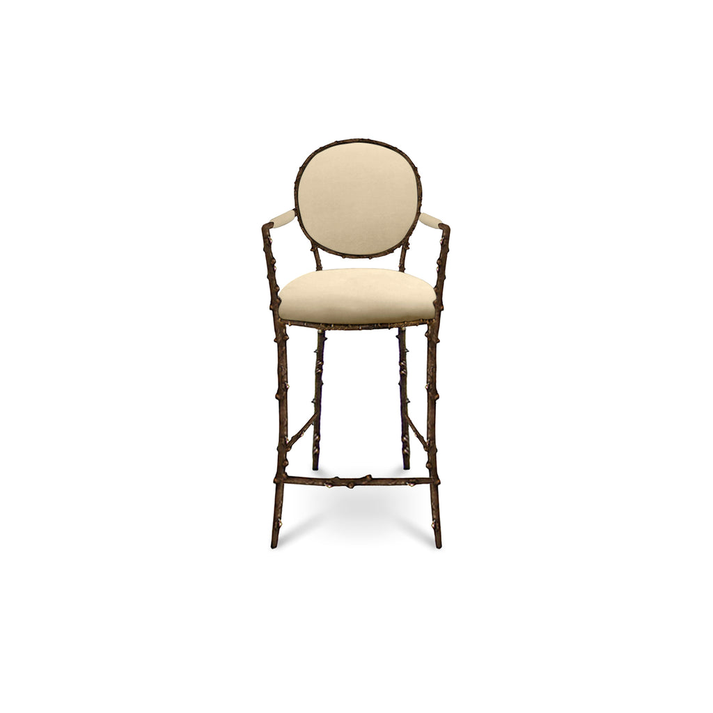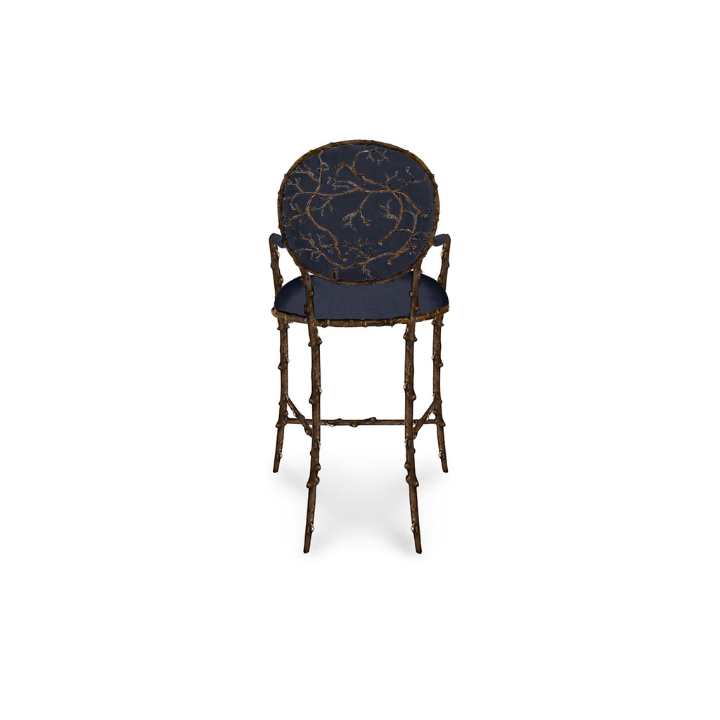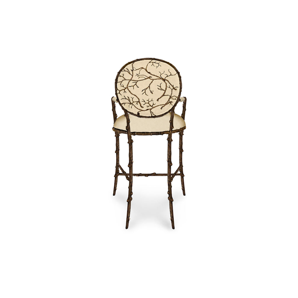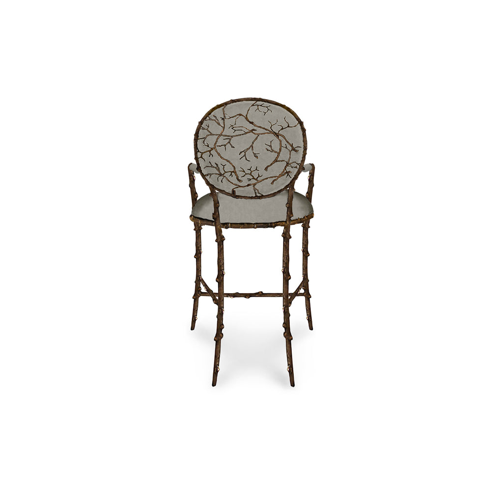 Our artisans have masterfully captured the alluring essence of an enchanted forest with this bar stool. Its antique gilded branch like structure can't help but mesmerize the beholder. Her fully upholstered body pops as the backdrop to the glinting, whimsical branch frame.