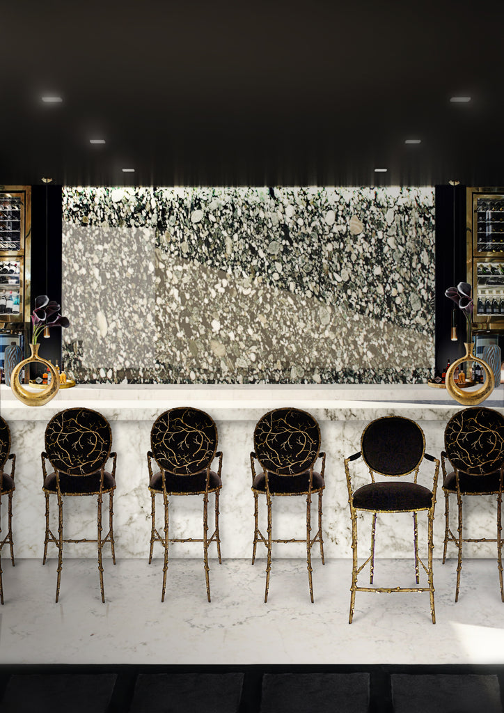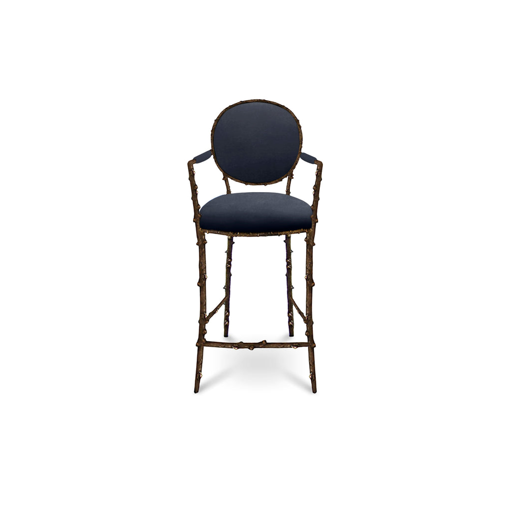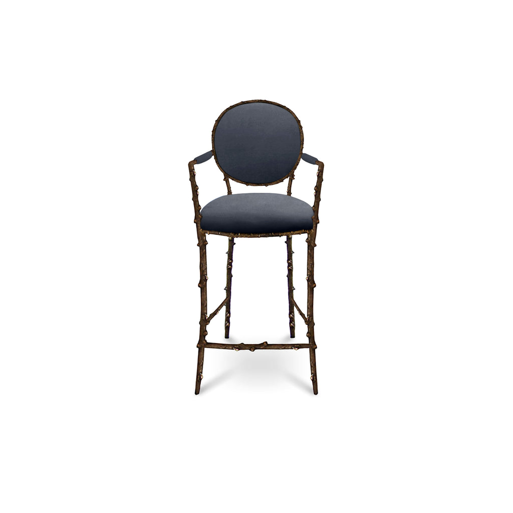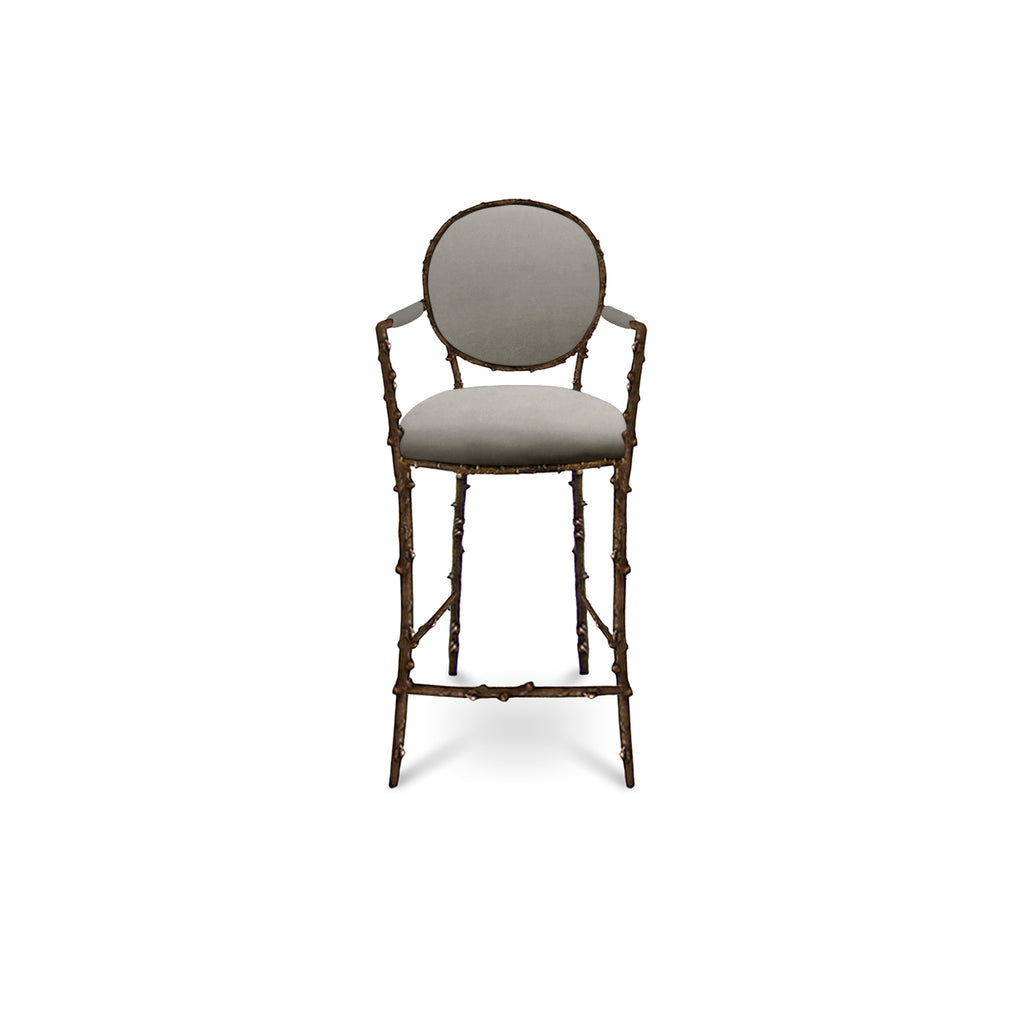 Our artisans have masterfully captured the alluring essence of an enchanted forest with this bar stool. Its antique gilded branch like structure can't help but mesmerize the beholder. Her fully upholstered body pops as the backdrop to the glinting, whimsical branch frame.
