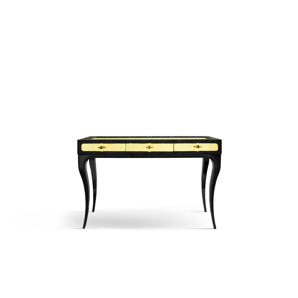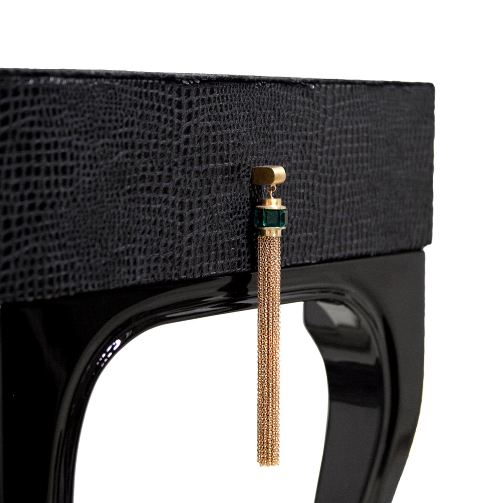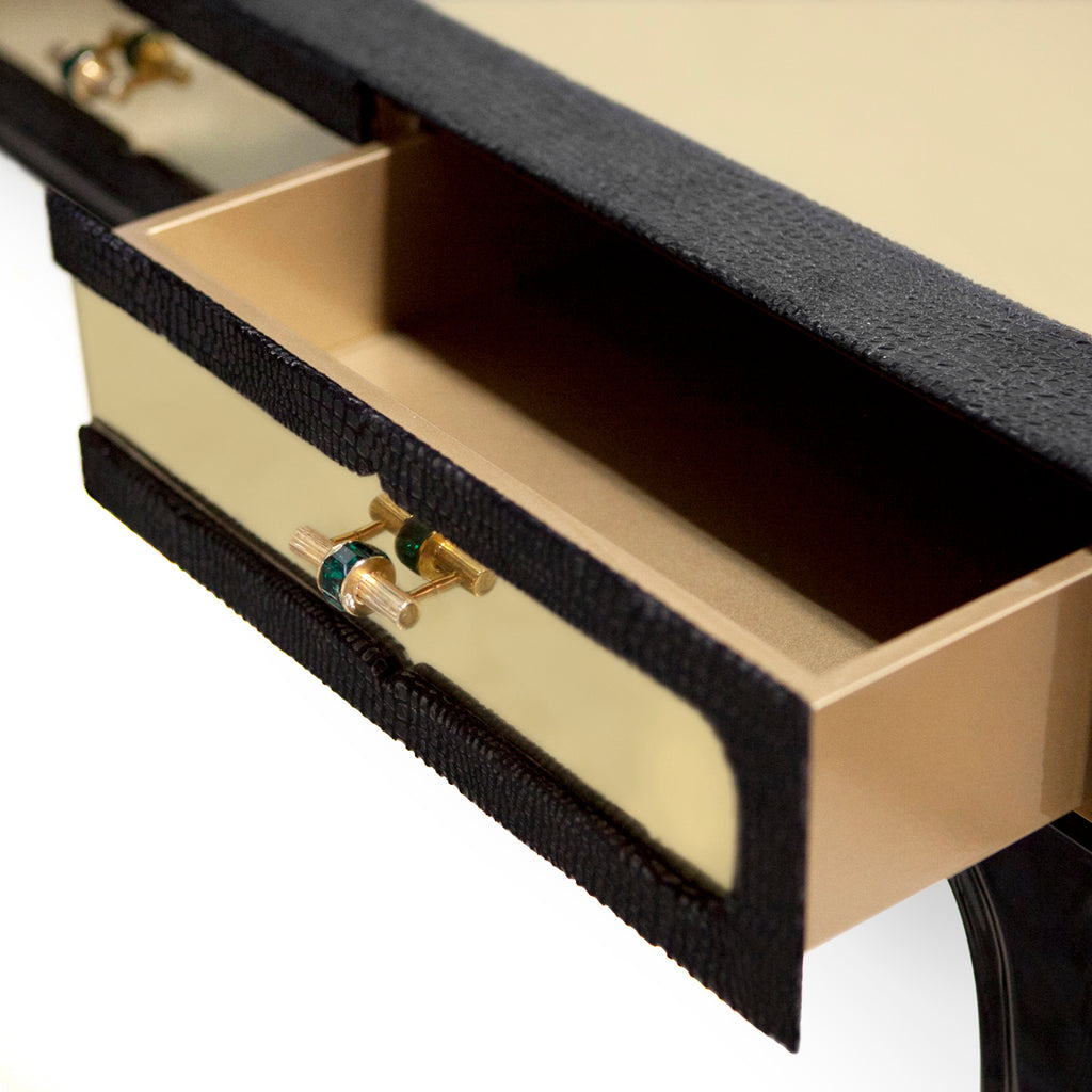 Exuding feelings of fantasy, this highly coveted dressing table is bold, daring and seductive. Her wooden frame is cloaked in an exotic fabric with a complementing metal top, juxtaposed with the mesmerizing movements of shimmering glass tassels.