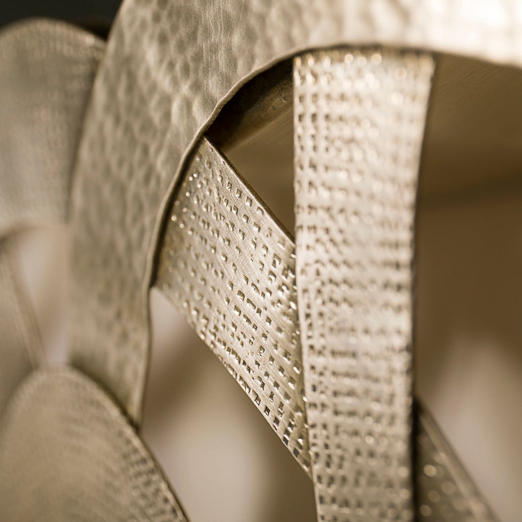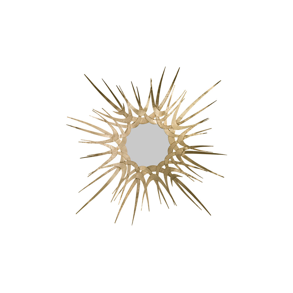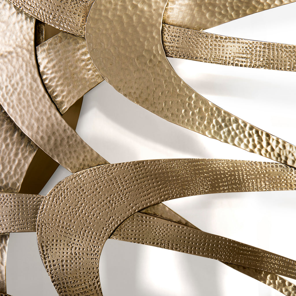 Sculptured and shimmering tones of hammered and textured metal with a hint of hard edge surround a perfectly cut convex mirror.
