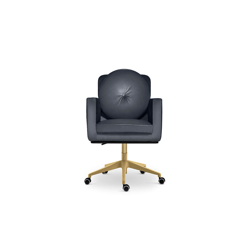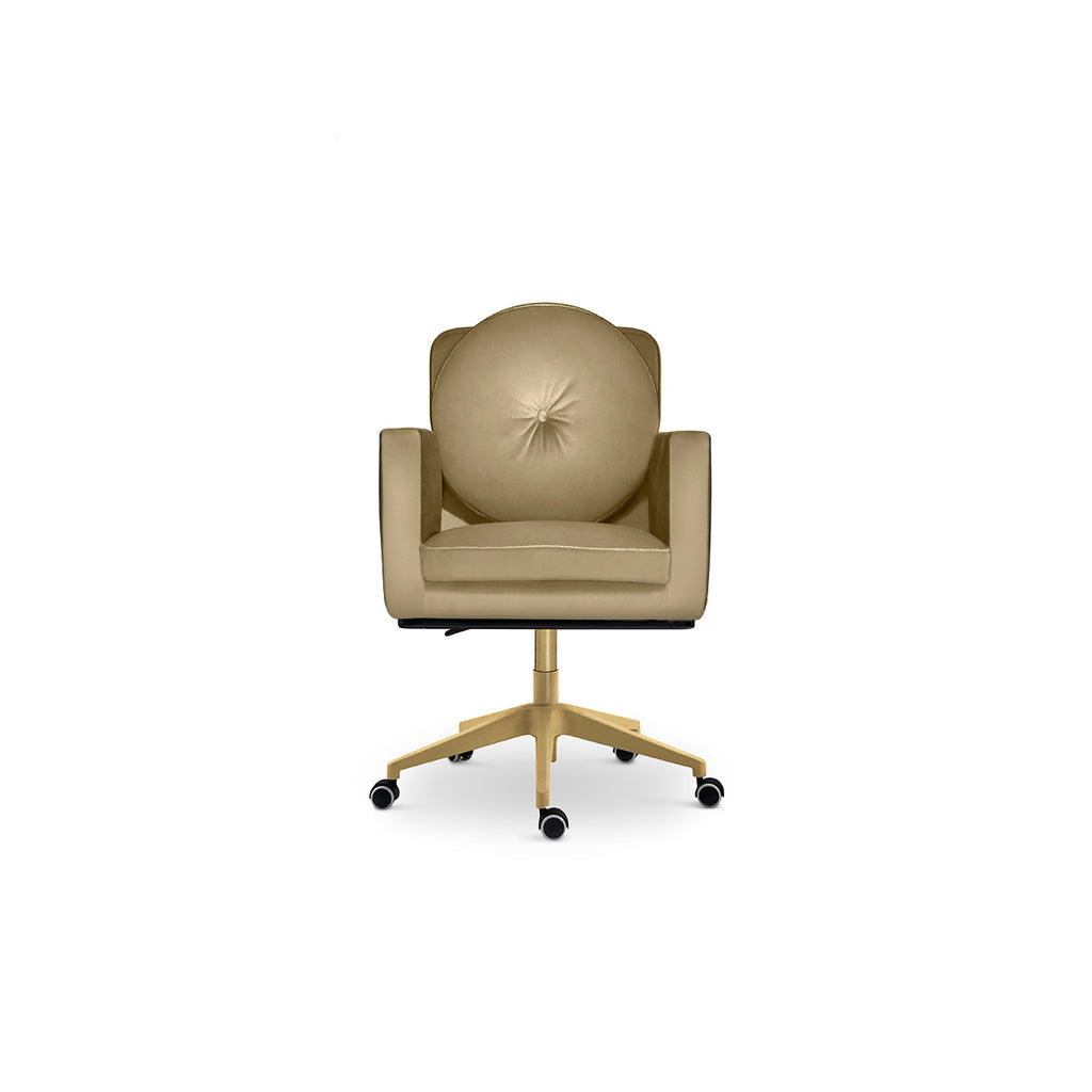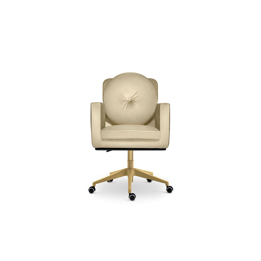 Hollywood Regency is brought to life with this fabulous desk chair. A feminine round cushioned chair back with a chic singular tuft, angular arms, and a sleek five-star metal swivel base give Hemma its modern retro vibe.