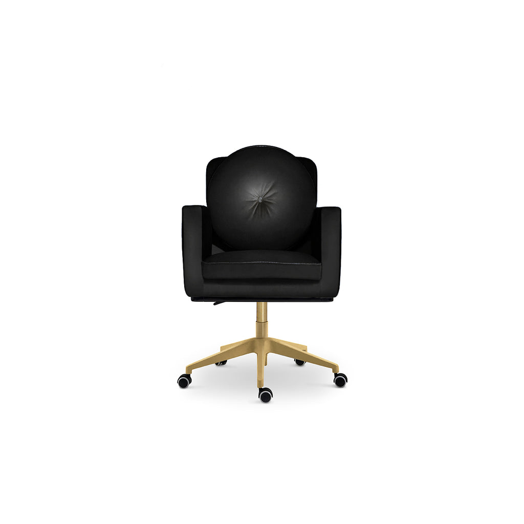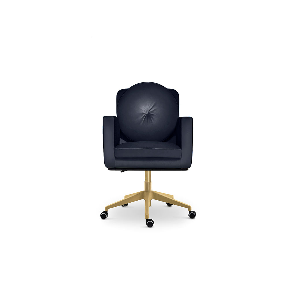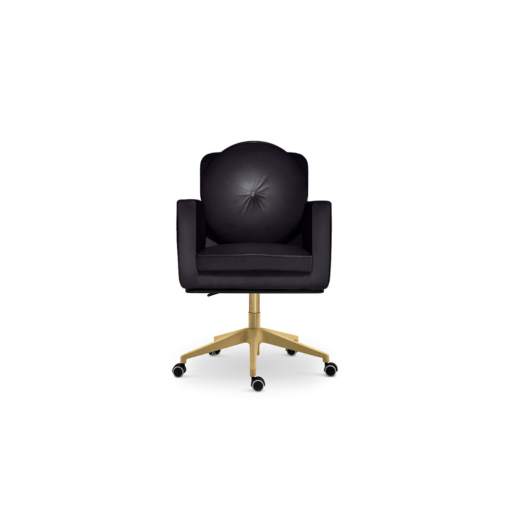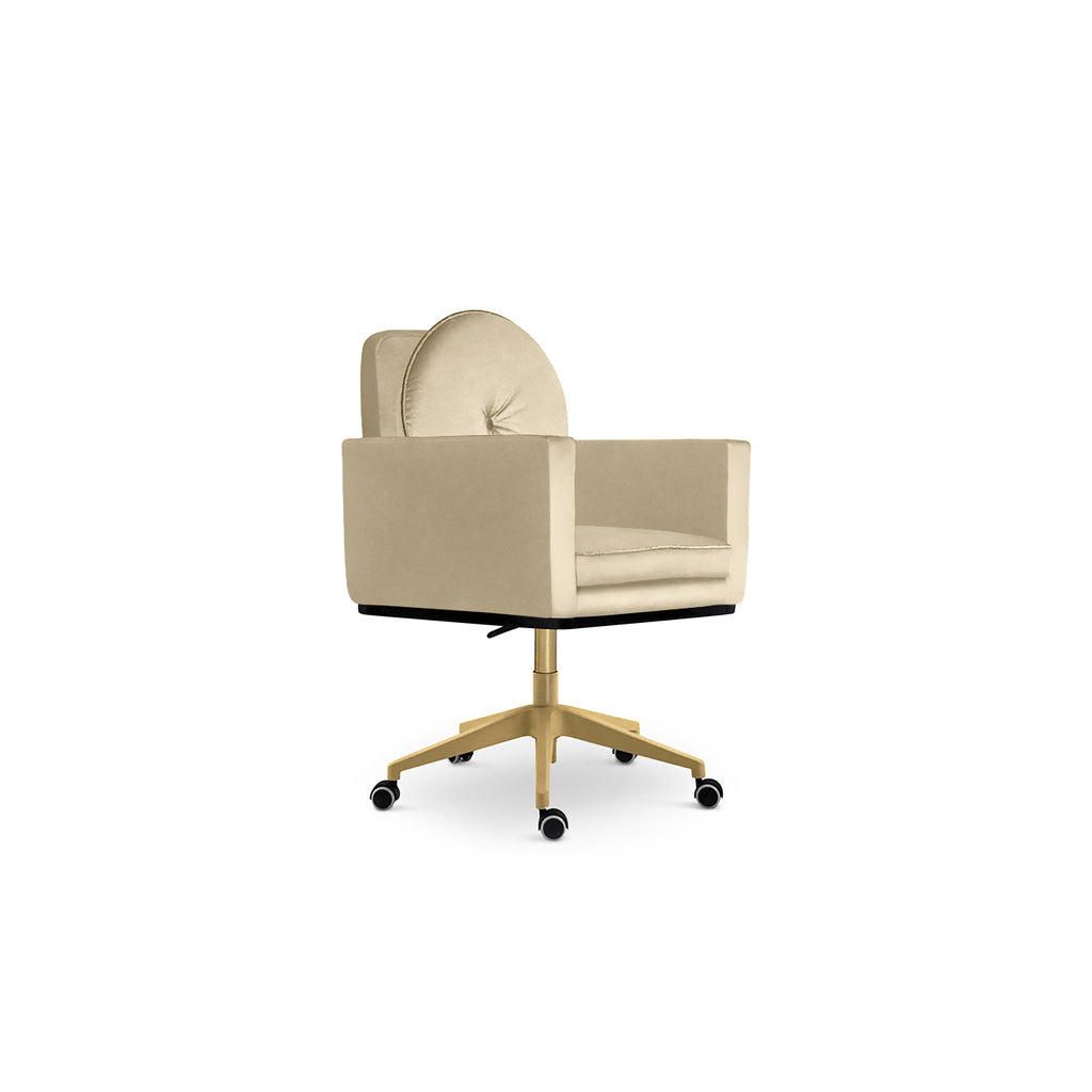 Hollywood Regency is brought to life with this fabulous desk chair. A feminine round cushioned chair back with a chic singular tuft, angular arms, and a sleek five-star metal swivel base give Hemma its modern retro vibe.
