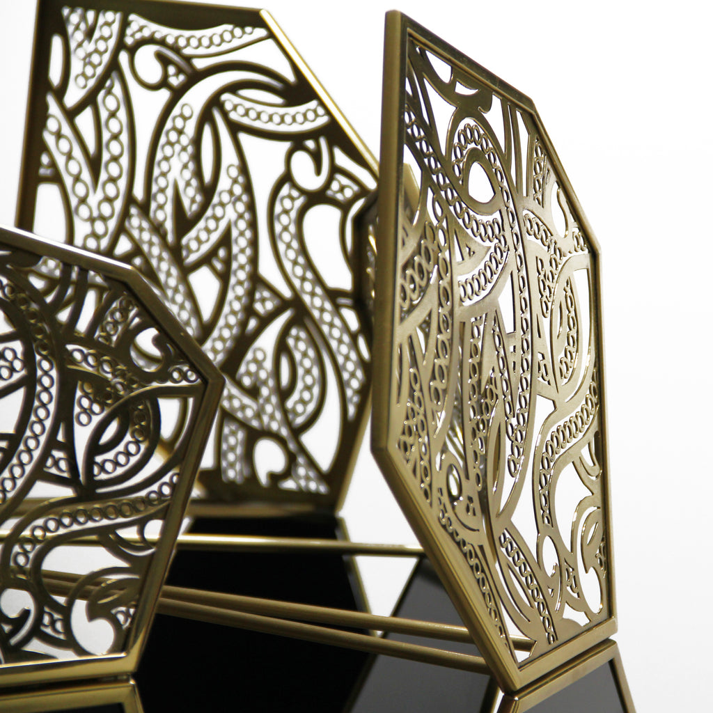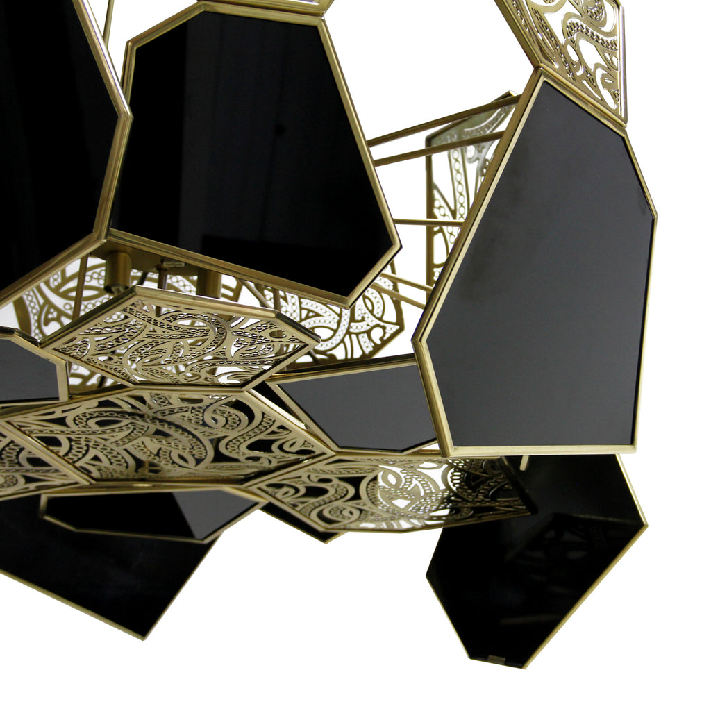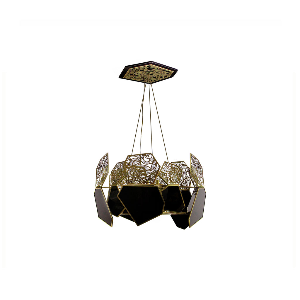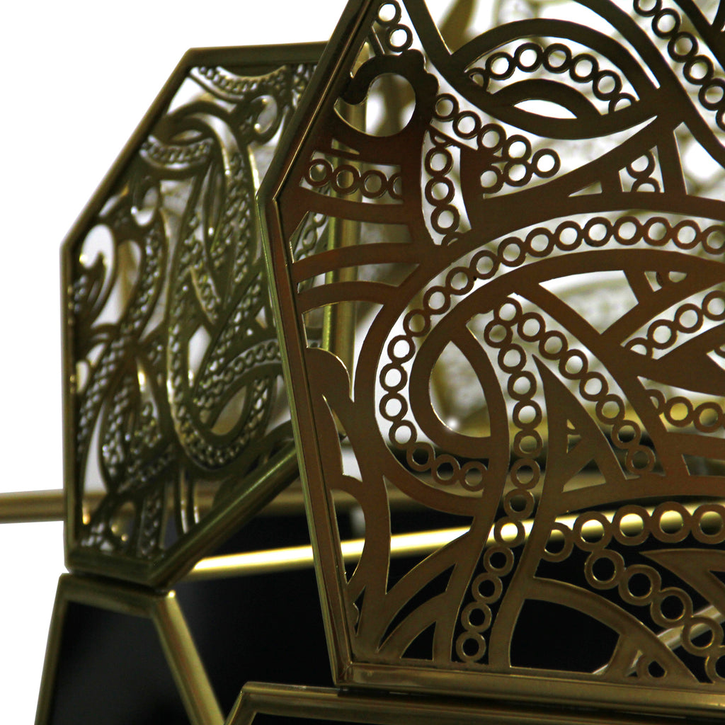 This sleek and elegant chandelier will hypnotize its audience. You will become mesmerized as the intricately fashioned chandelier coils and bends in golden spirals; weaving itself elaborately within the sharp polished lines of the hexagonal silhouette. The graceful pattern of the metal detailing compliments the painted wood component of this piece.
