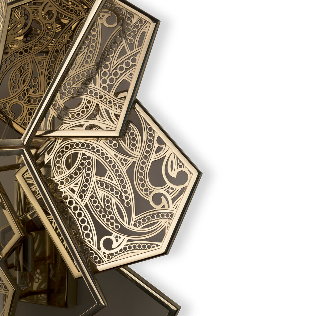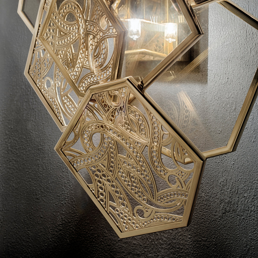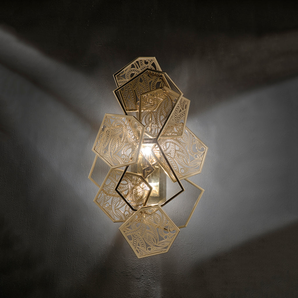 This sleek and elegant chandelier will hypnotize its audience. You will become mesmerized as the intricately fashioned chandelier coils and bends in golden spirals; weaving itself elaborately within the sharp polished lines of the hexagonal silhouette. The graceful pattern of the metal detailing compliments the painted wood component of this piece.