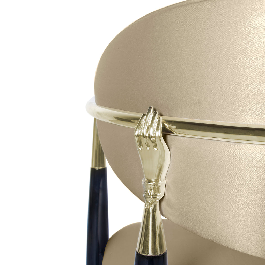 Try not to get handsy with the flirty and modern design of the Nahéma II chair. Her sweet seat and contemporary detached back are bound by a metal and lacquer frame complete with two hand details, insistently grasping at your desire.