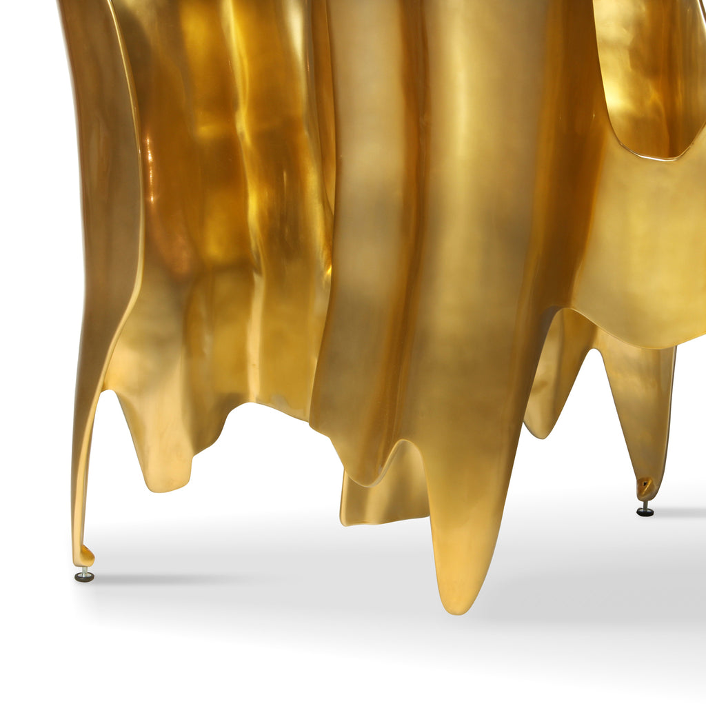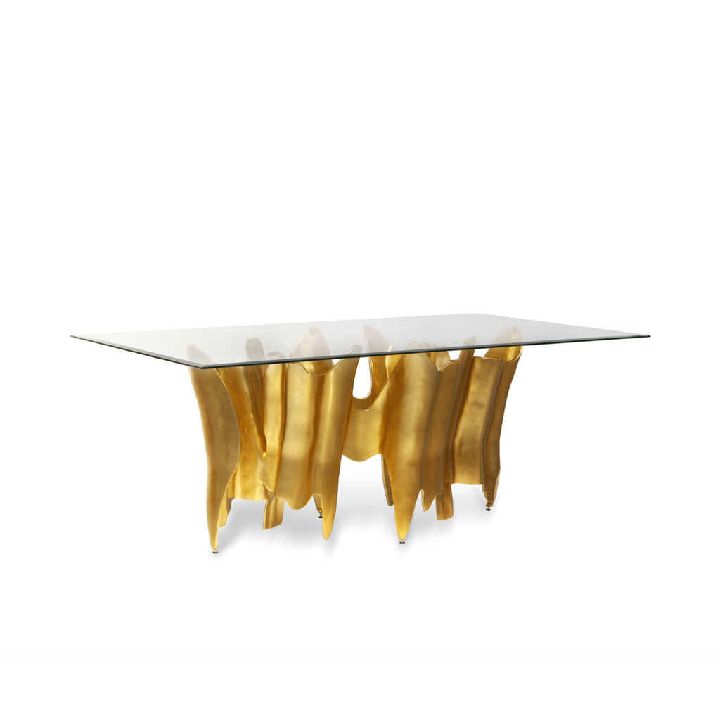 Initially it is a dining table. Then it becomes a dining table cut from clear glass. Your eyes begin to wander down, drinking in the rhythmic design of the aluminum base, following every crevice leading down only to head back up; compelling you to continue staring. Soon enough, the simplicity of the dining table disappears, leaving only an intoxicating illusion of art coming to life.