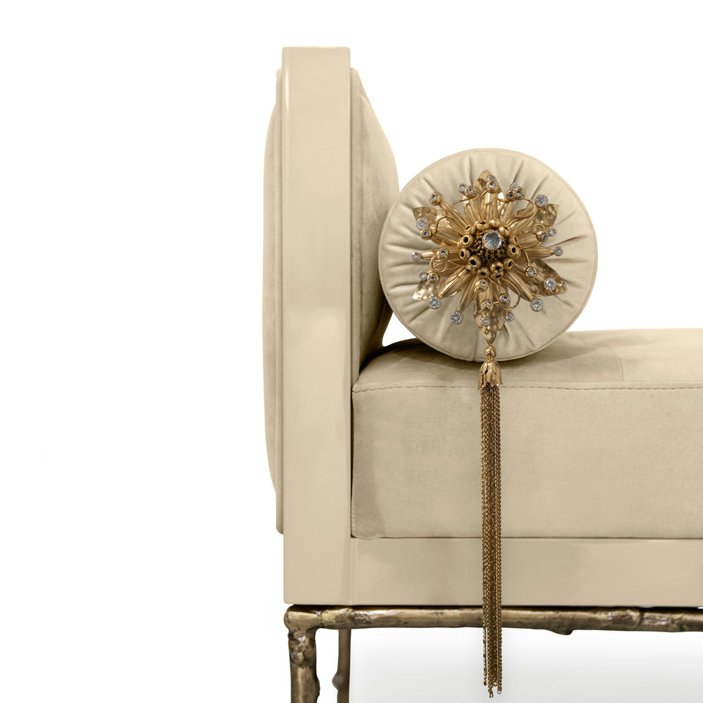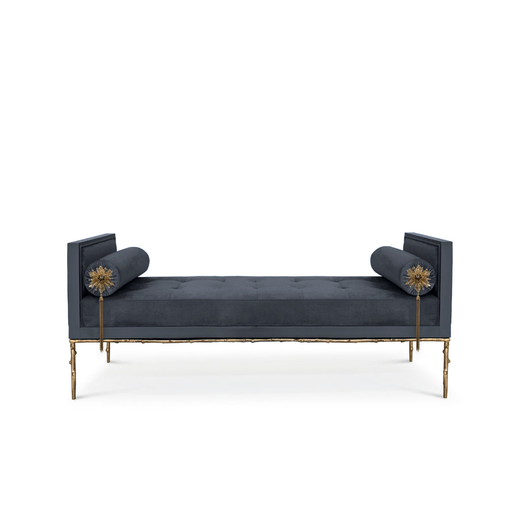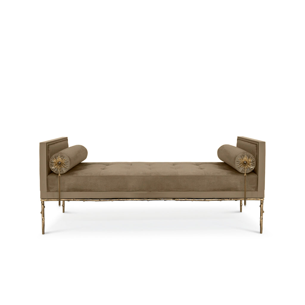 Not exactly flirtatious, but certainly not sweet, the Privê Day Bed guarantees sensuous drama. Exquisite flora inspired details adorn this seductive piece. A delicate branch-like base, stunning bronze & crystal jeweled bolsters, and sumptuous soft tufting make this an utterly desirable piece.