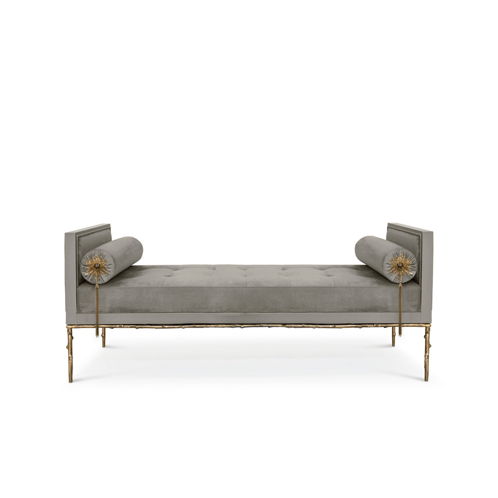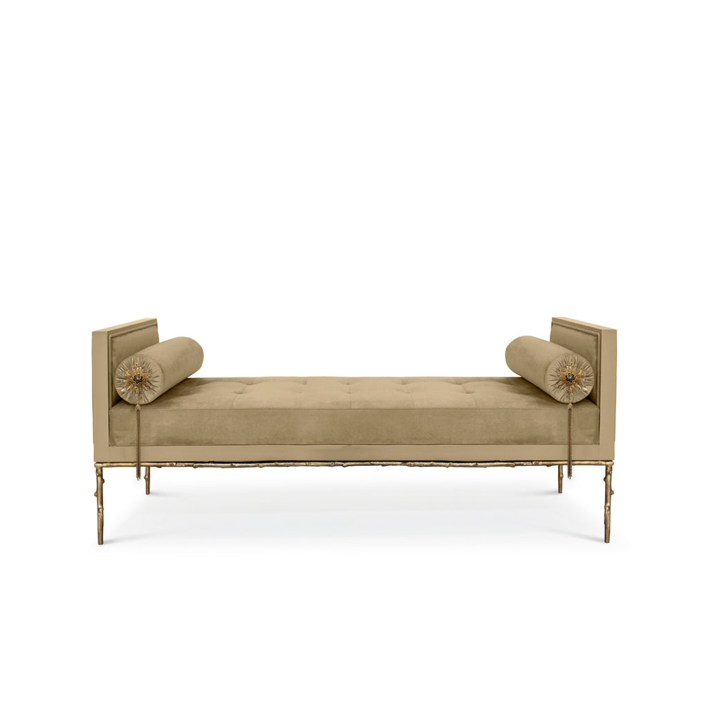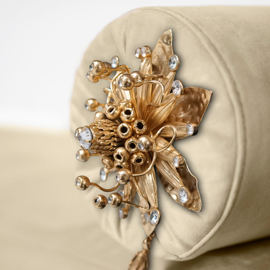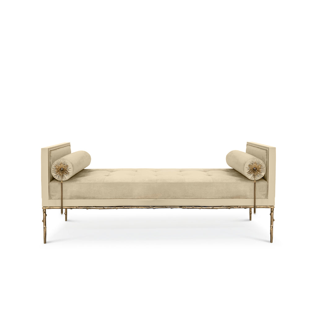 Not exactly flirtatious, but certainly not sweet, the Privê Day Bed guarantees sensuous drama. Exquisite flora inspired details adorn this seductive piece. A delicate branch-like base, stunning bronze & crystal jeweled bolsters, and sumptuous soft tufting make this an utterly desirable piece.