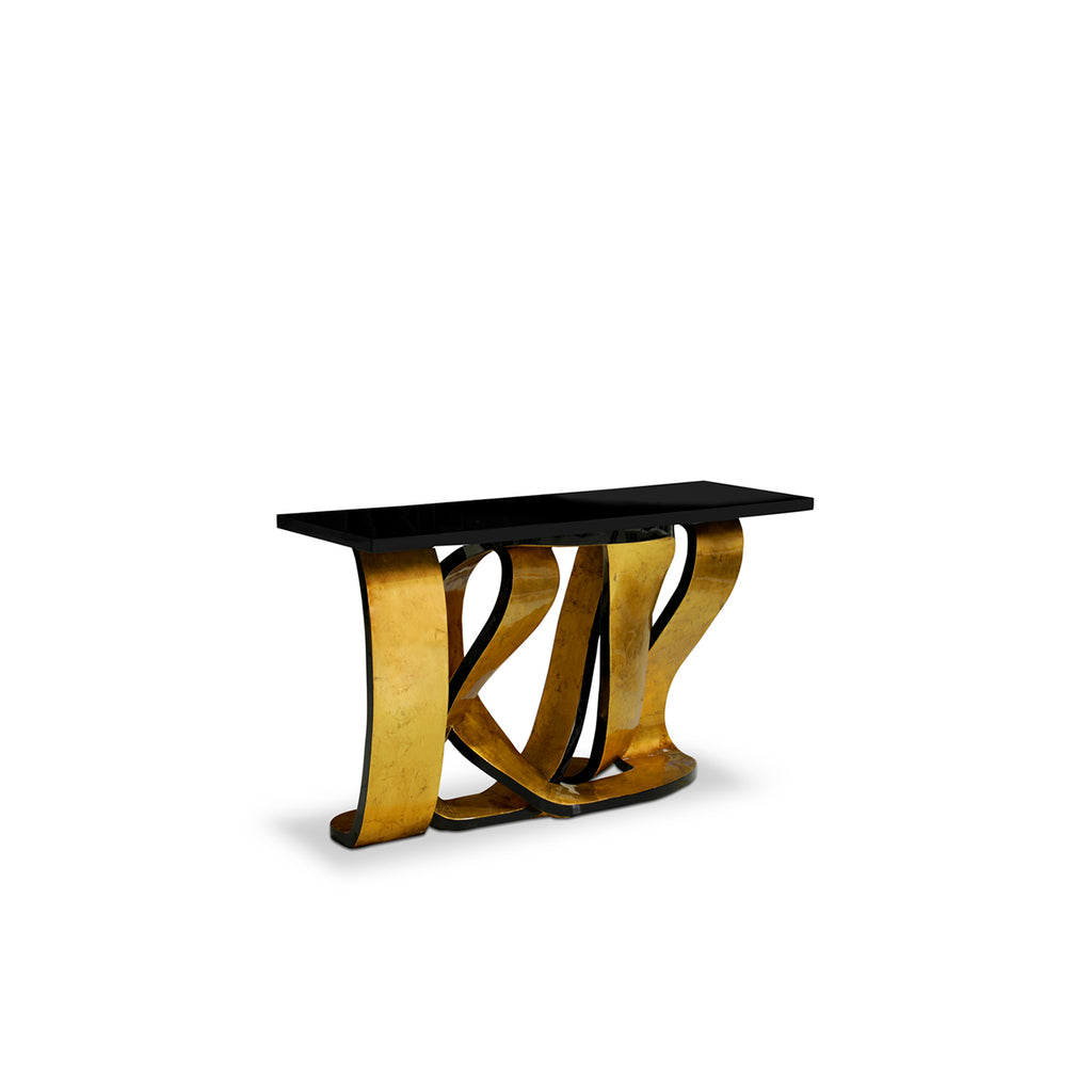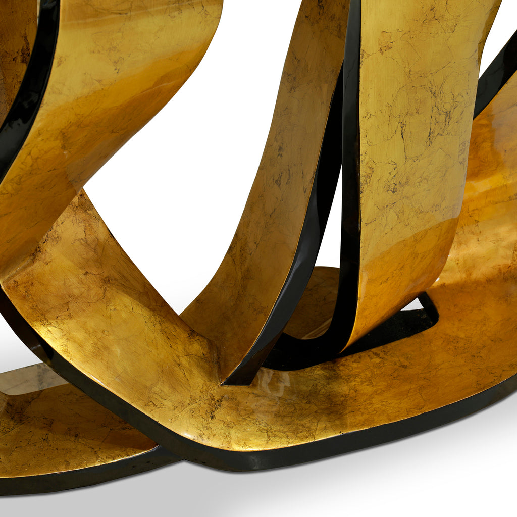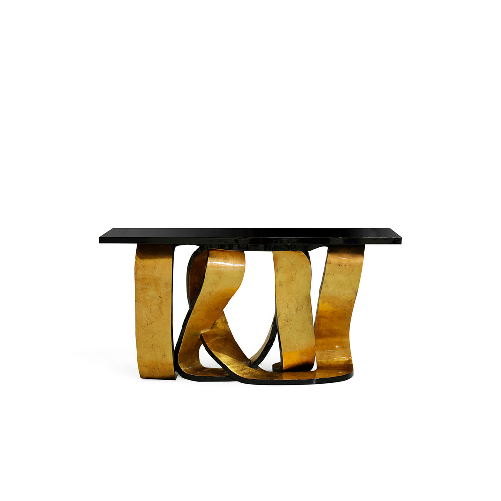 Get wrapped up in the rhythmic design of the Ribbon console table. The provocative twists and turns of the base are delicately adorned in gleaming metal leaf, mimicking the sheen of a girl’s hair ribbon. The luxury console table’s playful base is topped with a pristine high gloss black lacquer top.