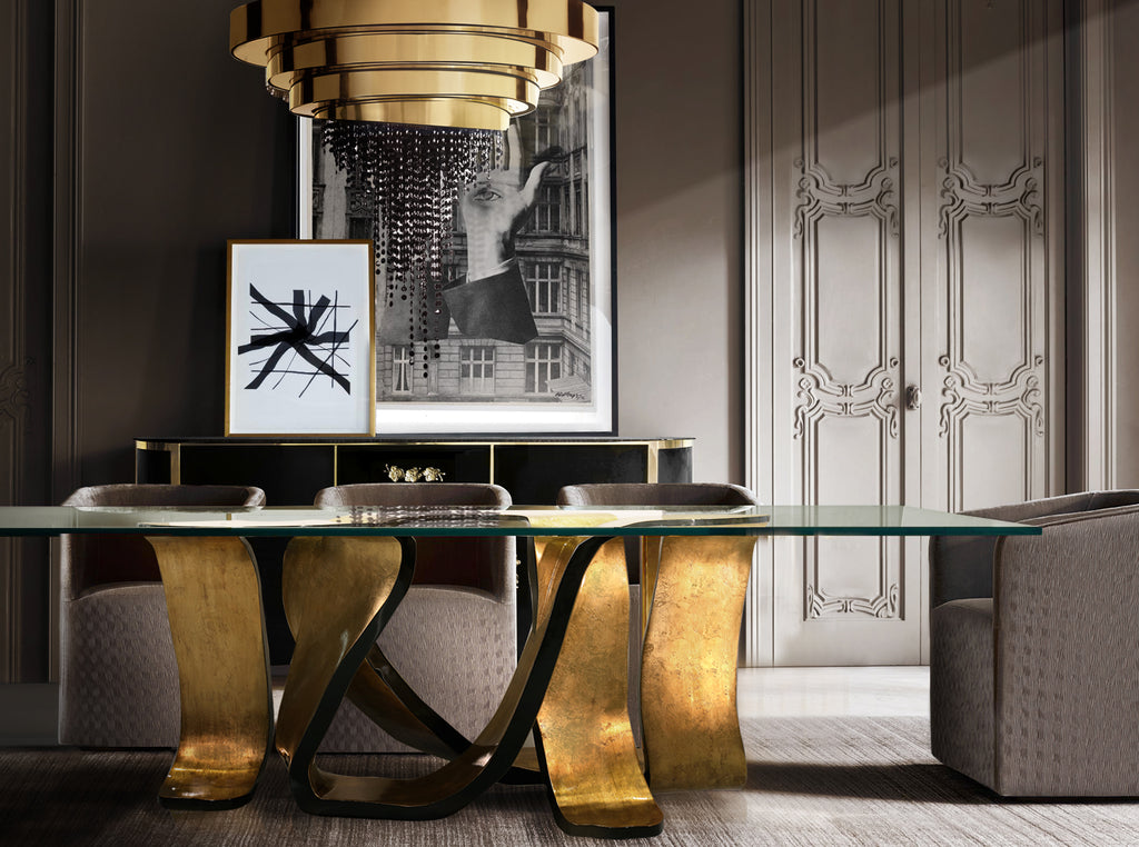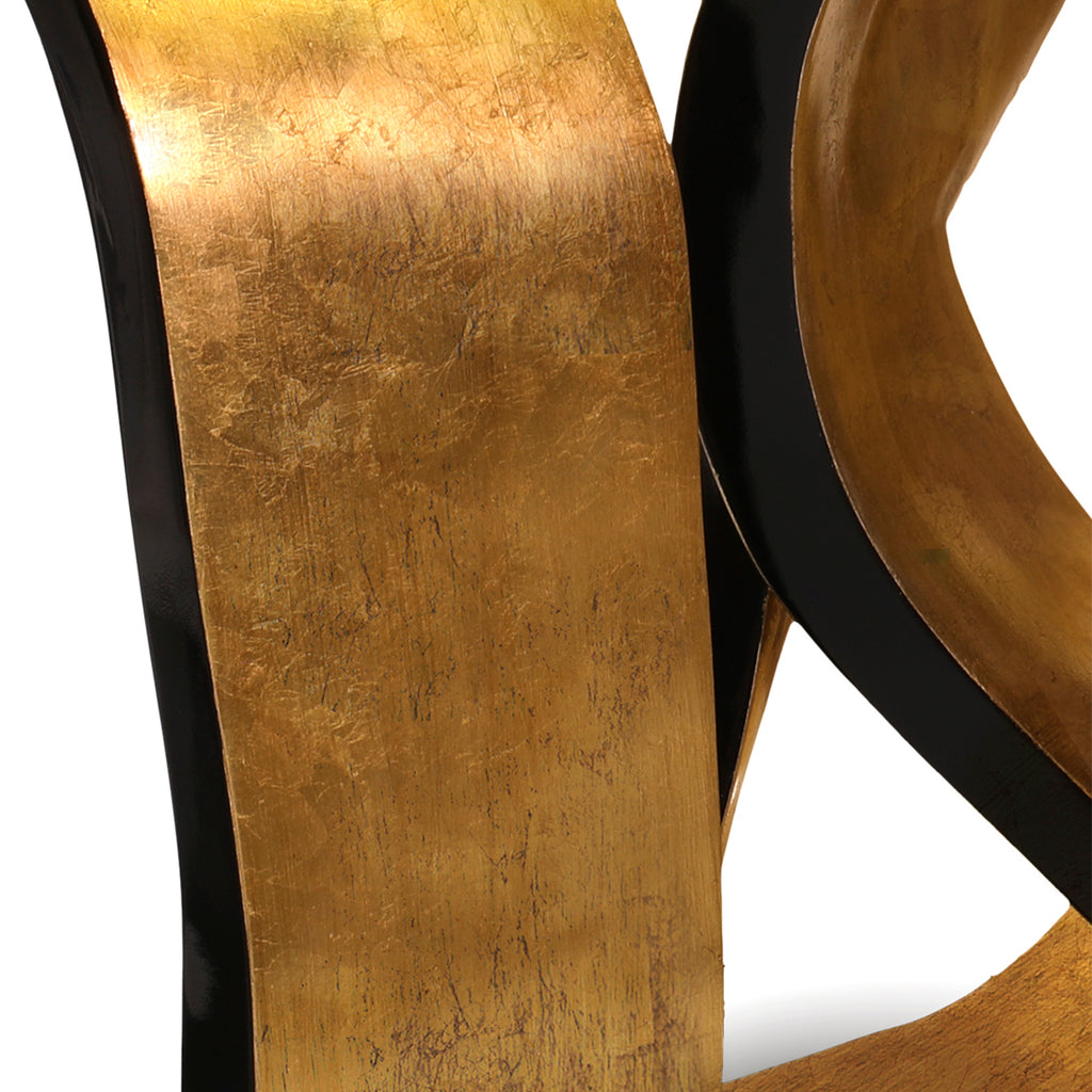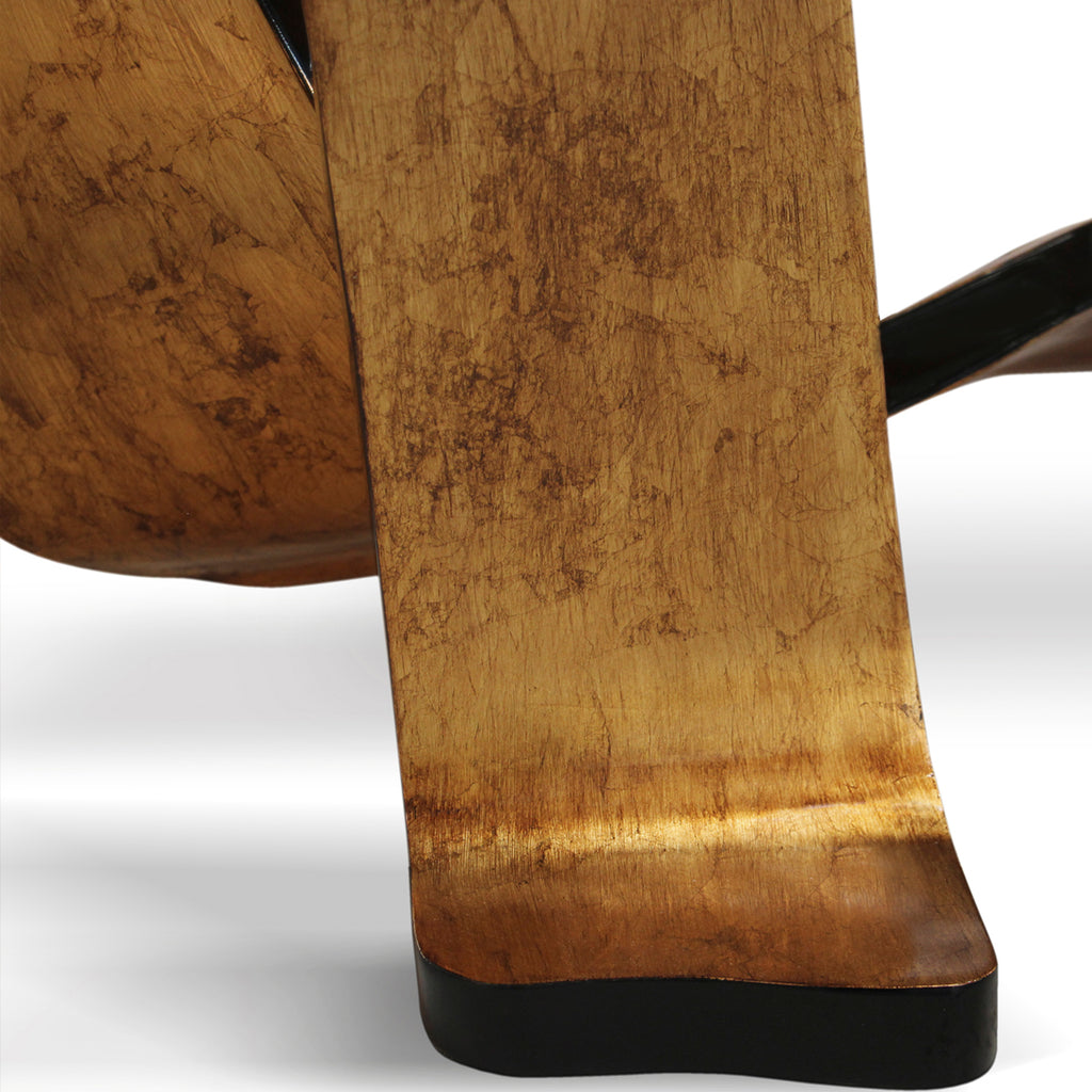 Get wrapped up in the rhythmic design of the Ribbon dining table. The provocative twists and turns of the base are delicately adorned in gleaming metal leaf, mimicking the sheen of a girl’s hair ribbon. The luxury dining table’s playful base is topped with a pristine tempered bronze glass top.