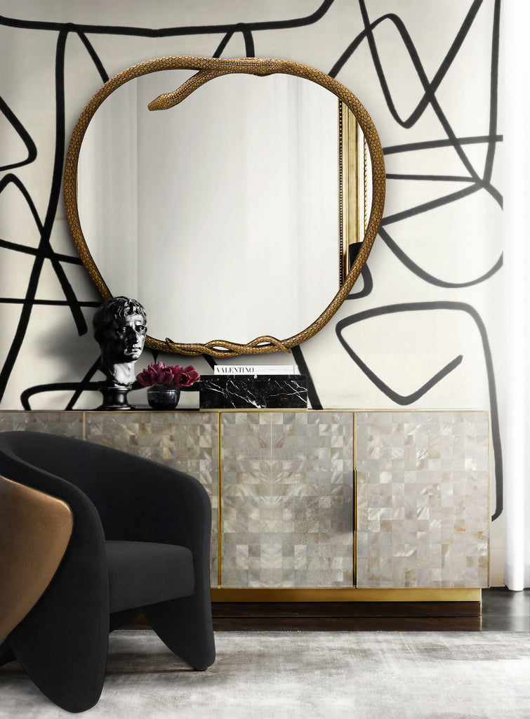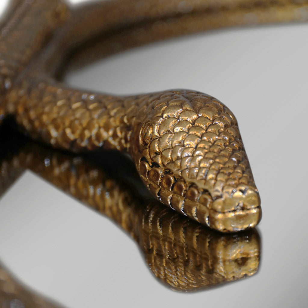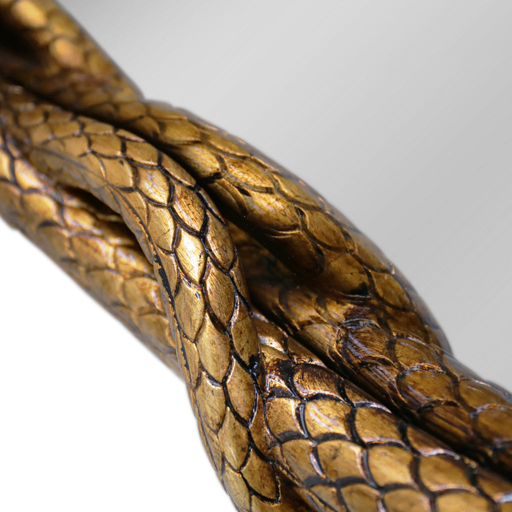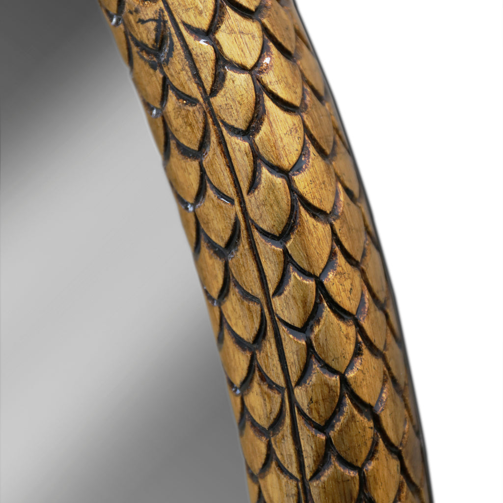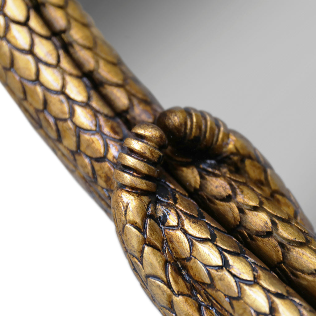 Be transformed as you gaze into the Serpentine II’s apple-shaped mirror. Framed in two intertwined serpent forms made of hand-carved wood this mirror is the perfect way to add a touch of exoticism to any interior setting.