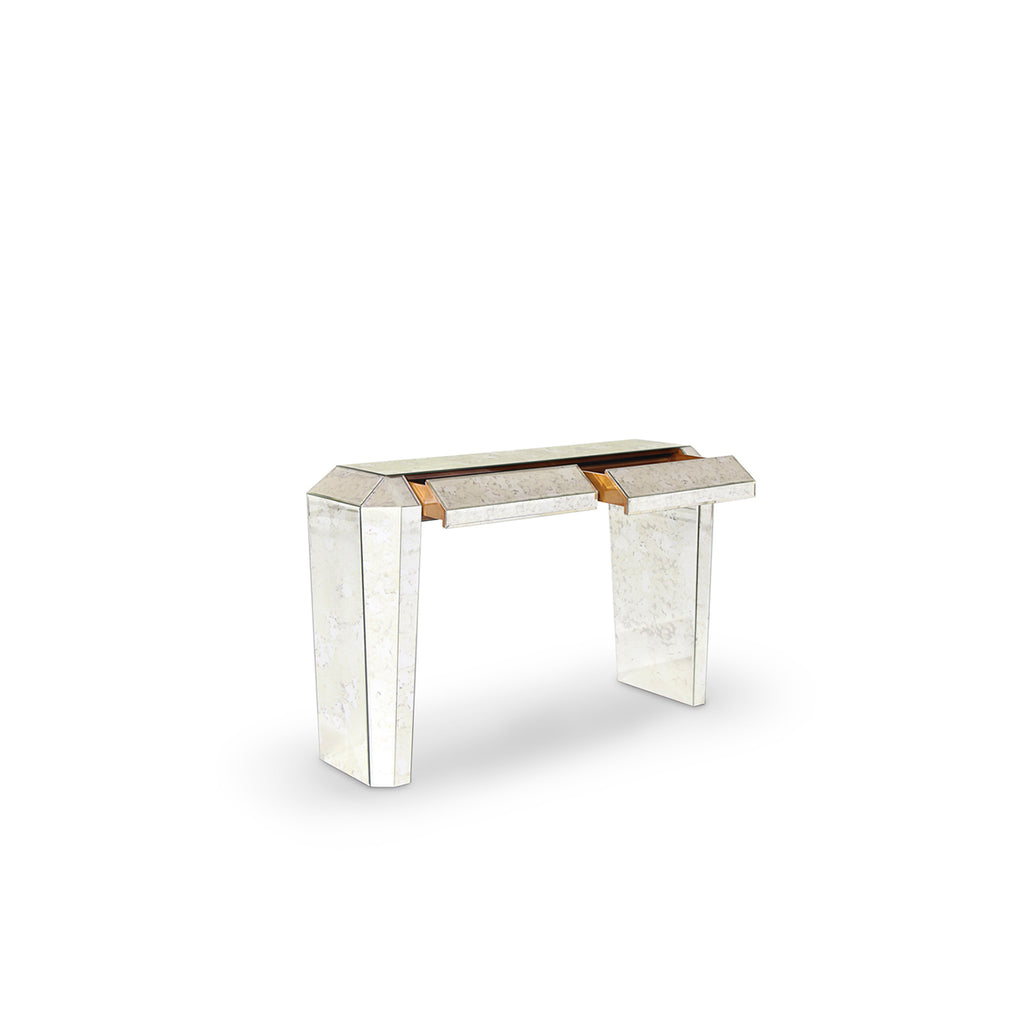 The provocatively vintage Tamara console drips with enough Art Deco decadence to transport you back to the glamour of the Roaring Twenties. Her frame’s strong geometric lines are coupled with luxurious and alluring mirror panels and two drawers.