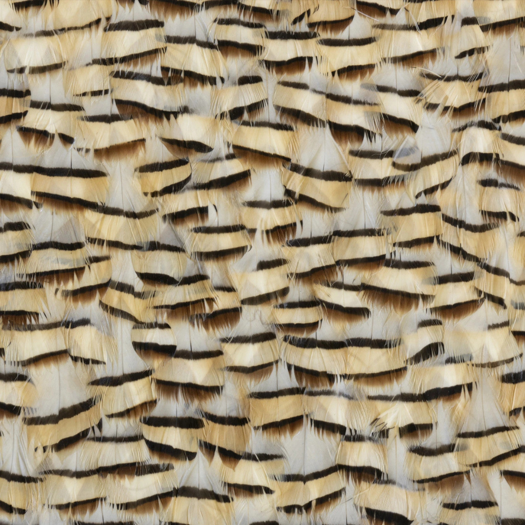 Soft cream feathers create wisps of texture among light gold-tone accents with deep brown borders, arranged in an organic lattice pattern to comprise this wall covering’s woven design.