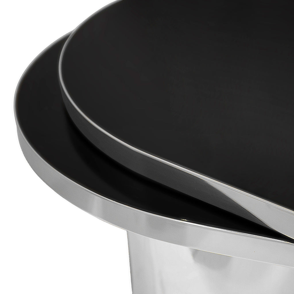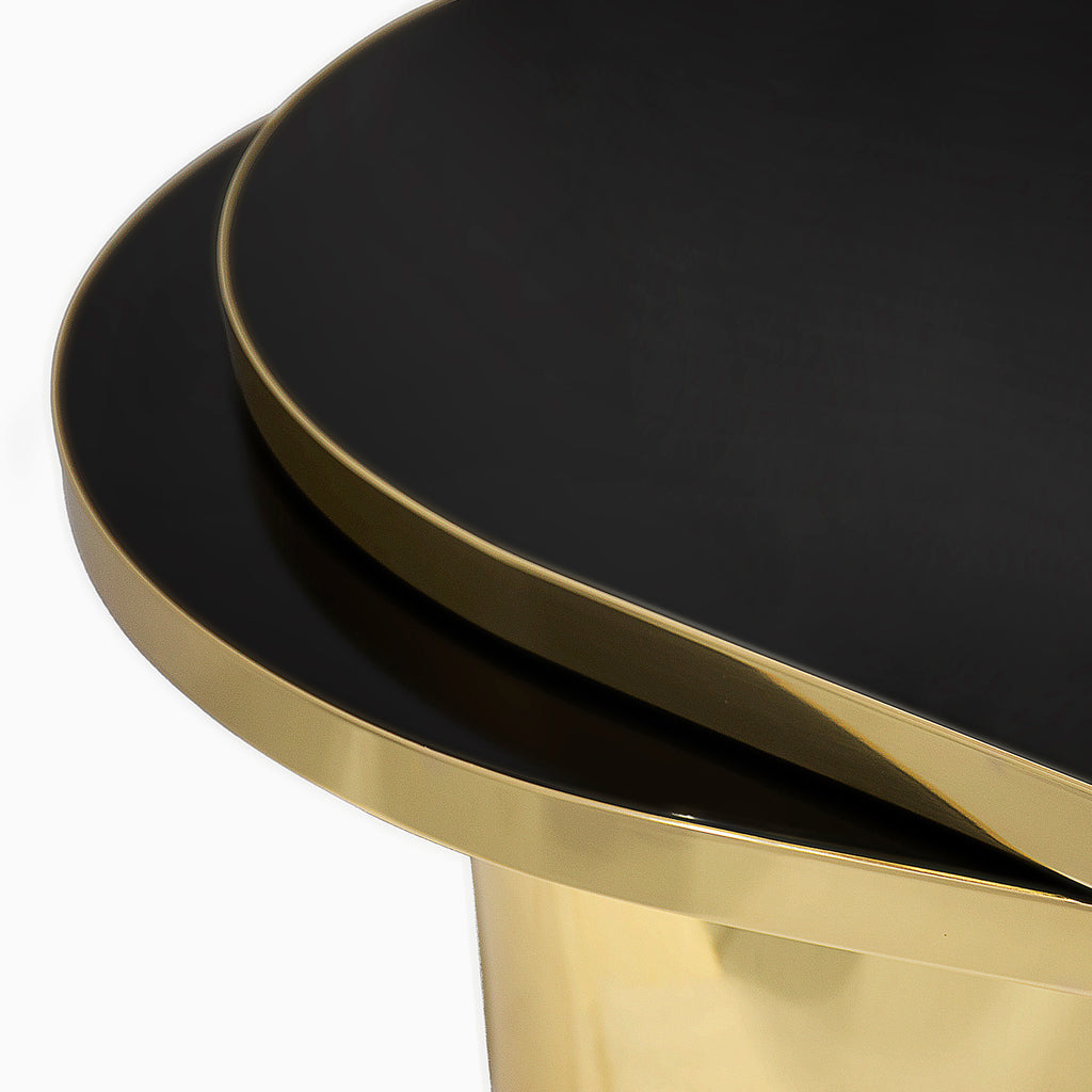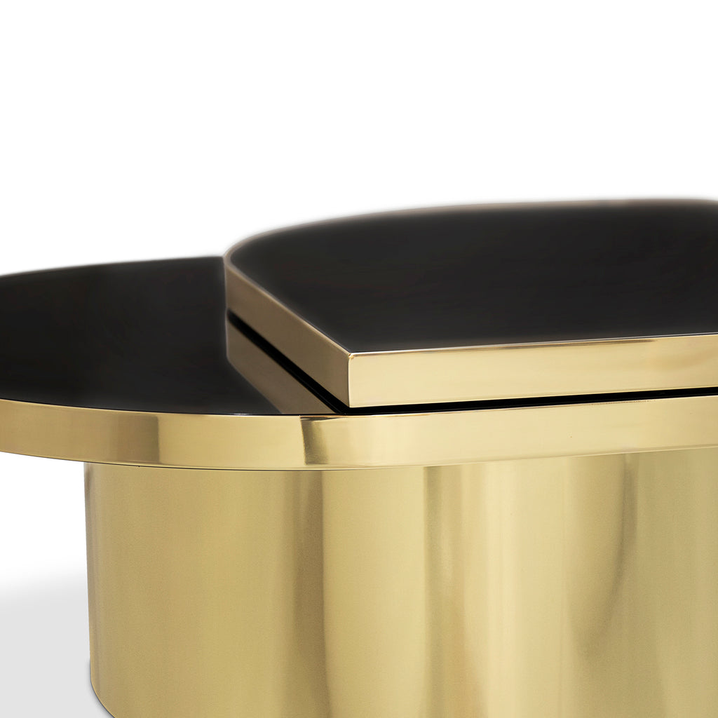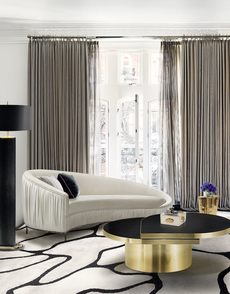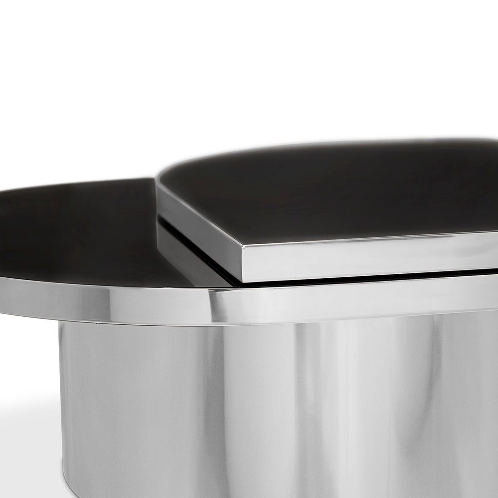 The delicate, crystal-clear clarity of a teardrop is revamped by KOKET in the Tears cocktail table. A striking combination of shaped glass and metal, its name takes a double meaning when the tear-shaped top swivels out to become a tiered cocktail table.