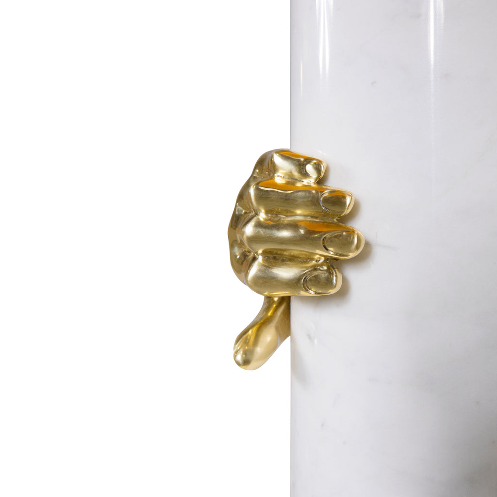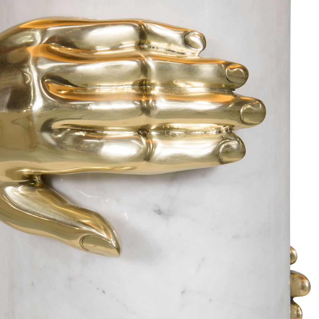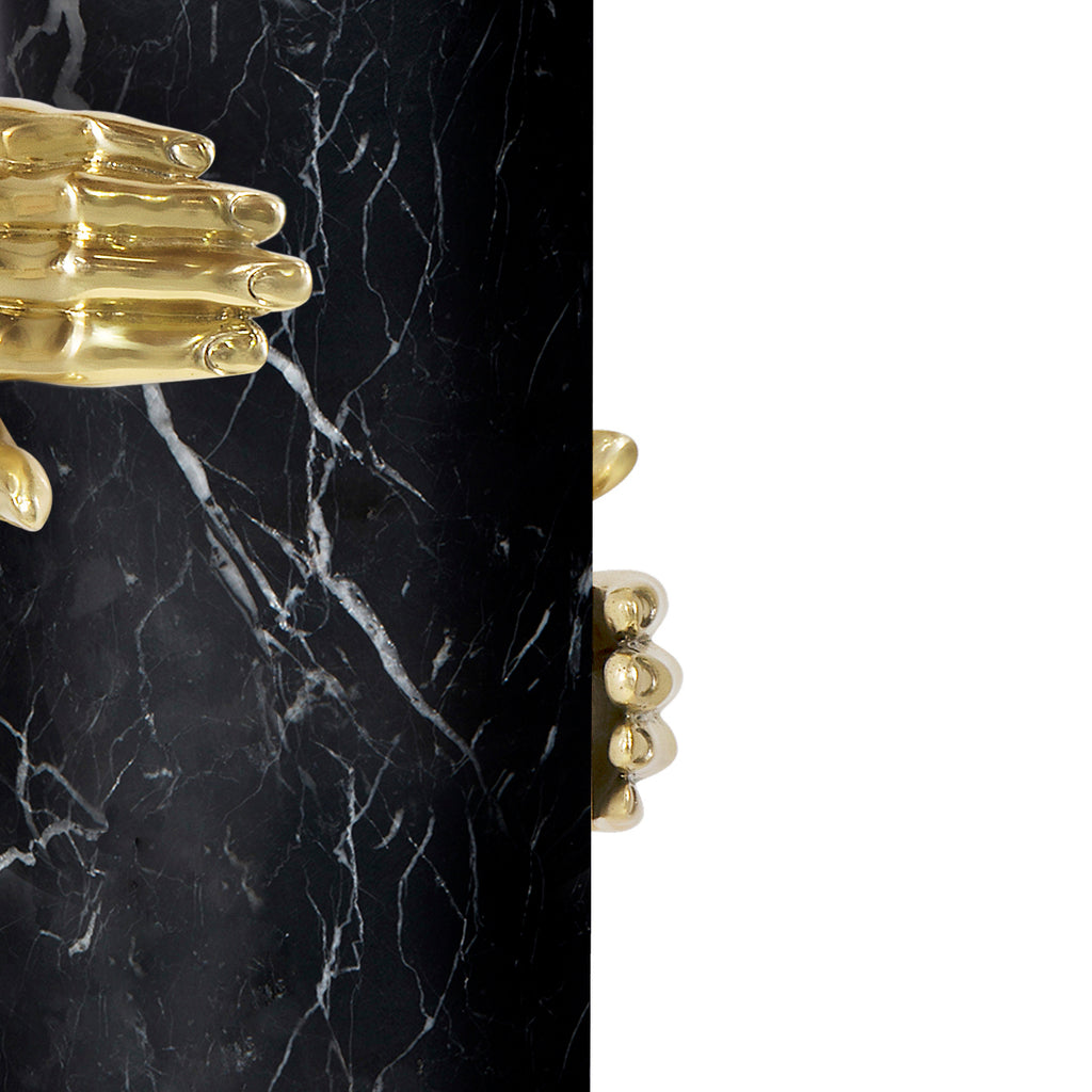 Seeking retribution, she fights to take back what is rightfully hers. Cast brass hands grasp the Vengeance lamp’s marble column structure embodying her impassioned struggle.